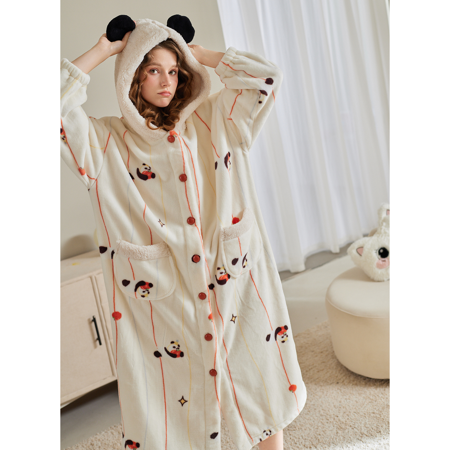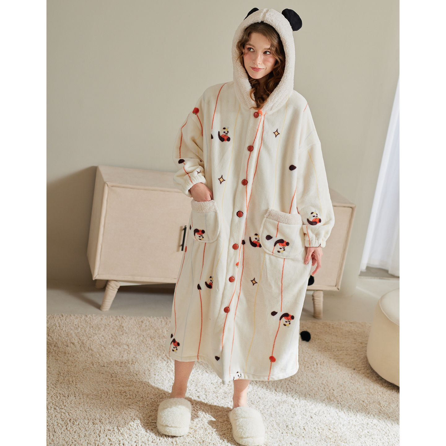 芬腾珊瑚绒睡袍女士秋冬抗静电连帽睡衣裙加绒加厚保暖熊猫家居服