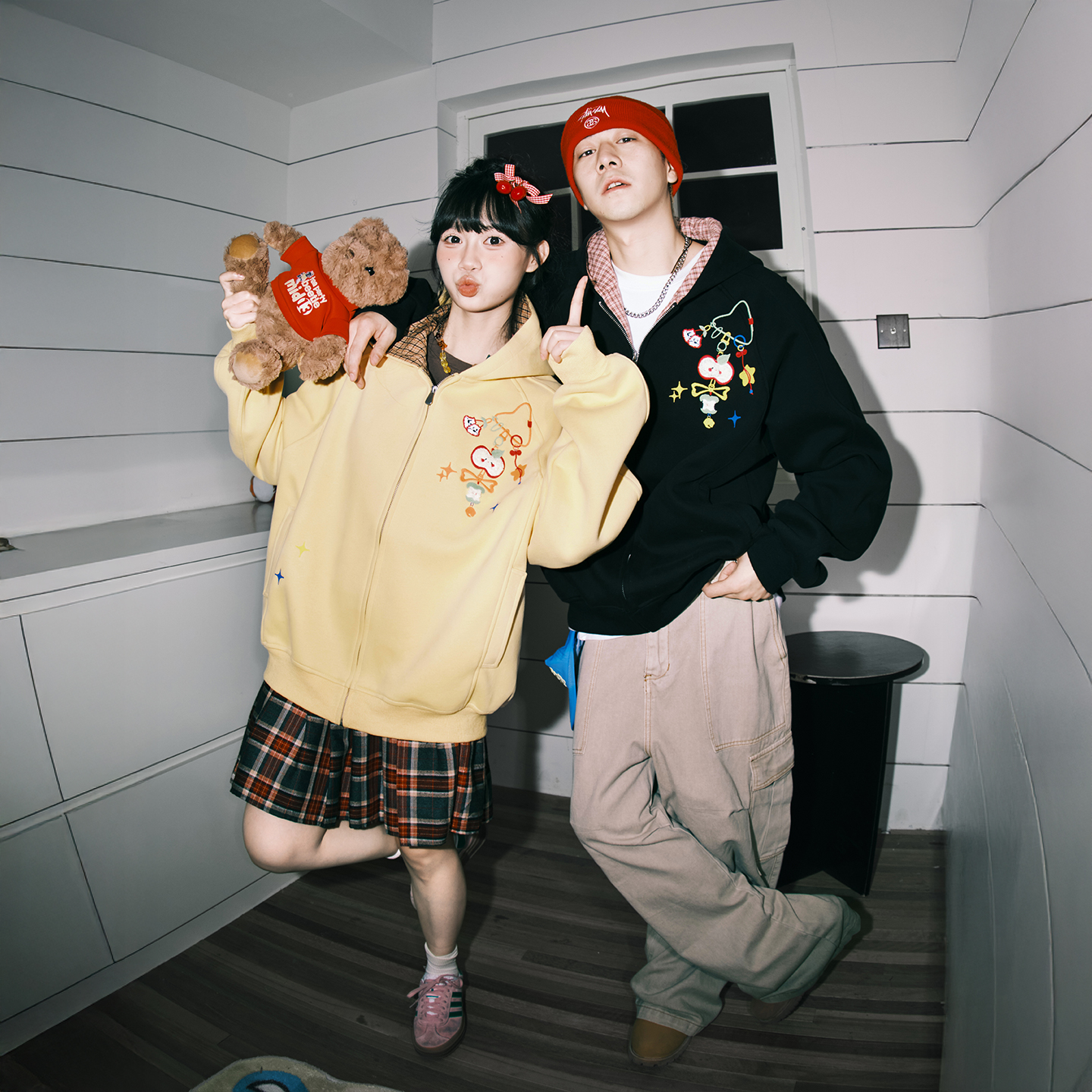 lemanism美式潮流卡通图案格子拼接连帽开衫卫衣男2025秋季外套女