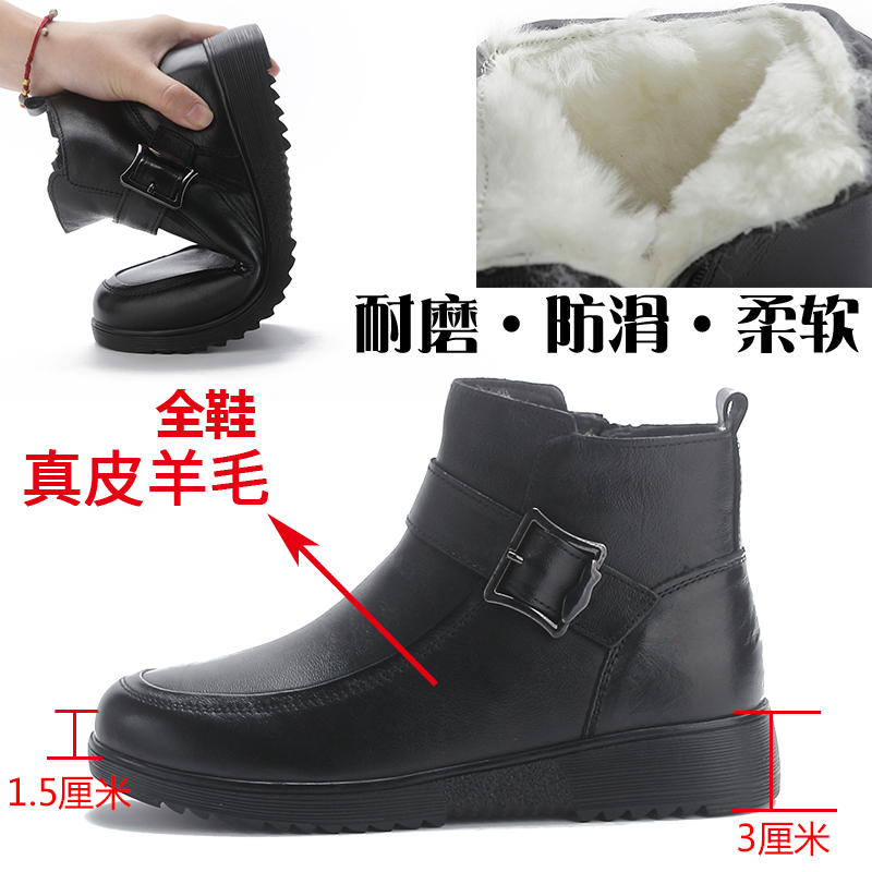 冬季加厚羊毛妈妈棉鞋真皮牛皮短靴中老年人女防滑保暖平底妈妈鞋