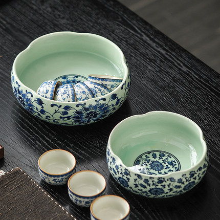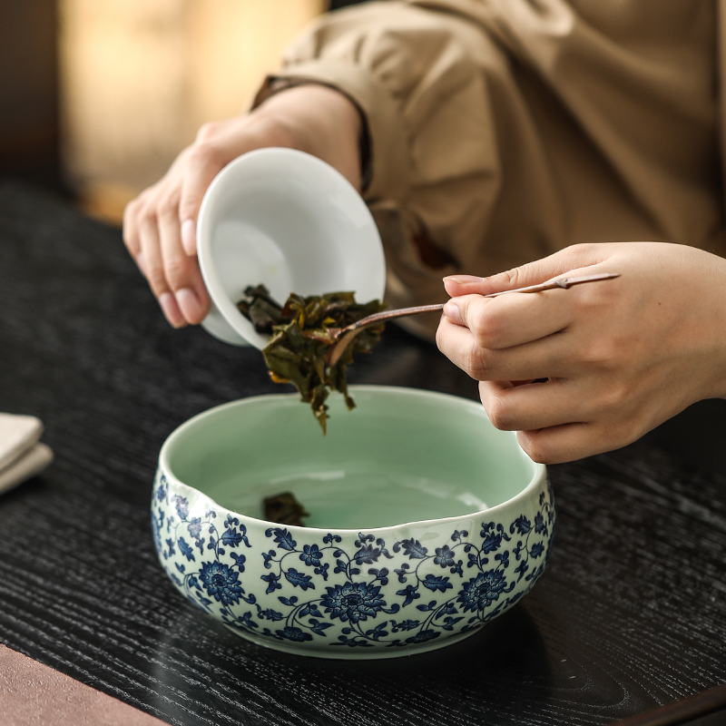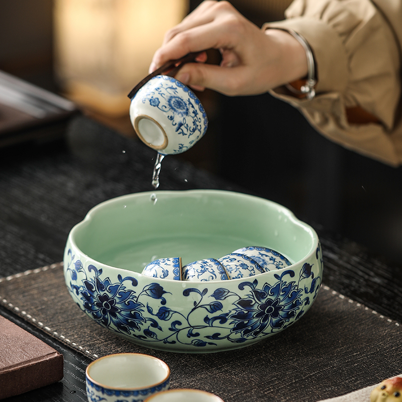 仿古青瓷青花缠枝莲陶瓷茶洗盆茶具家用大号茶杯洗笔洗茶渣缸水盂