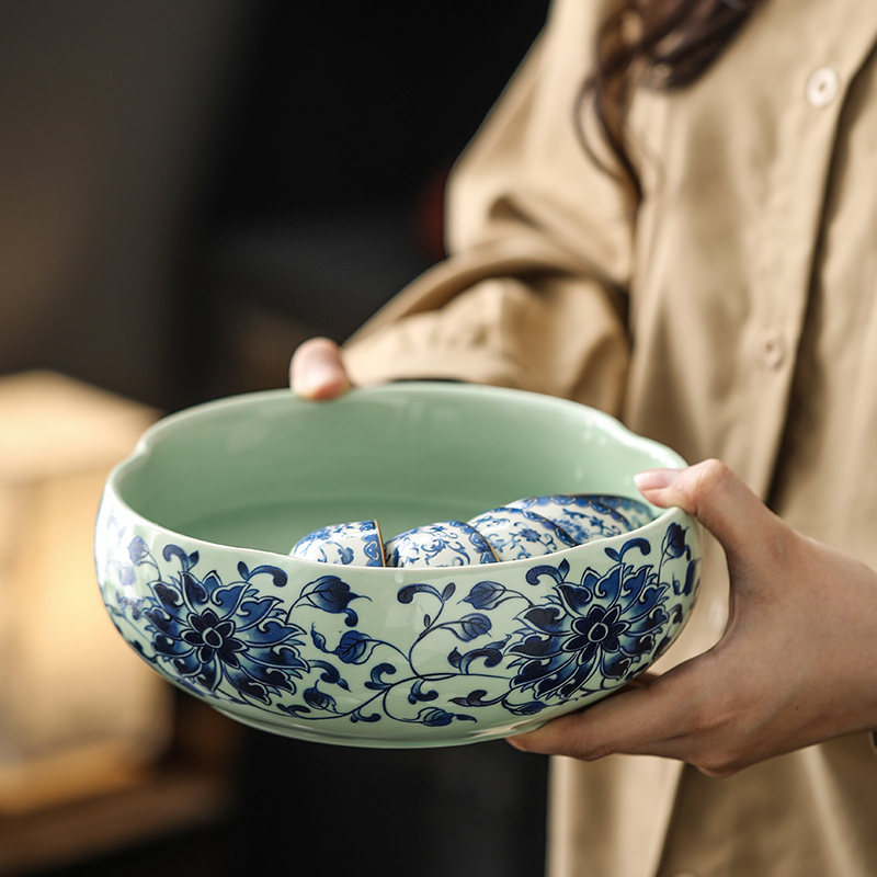 仿古青瓷青花缠枝莲陶瓷茶洗盆