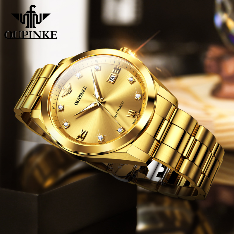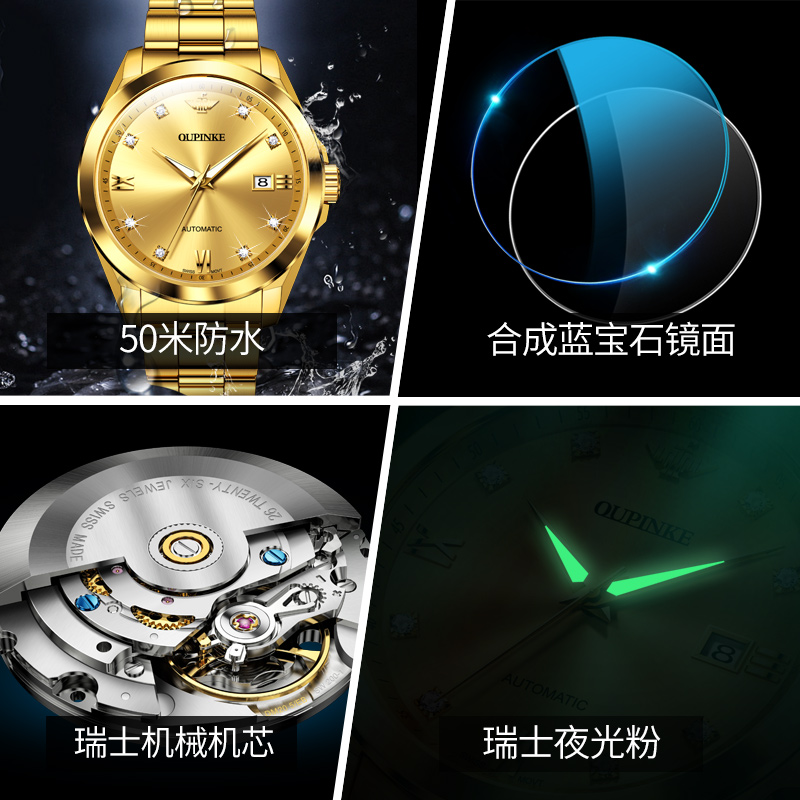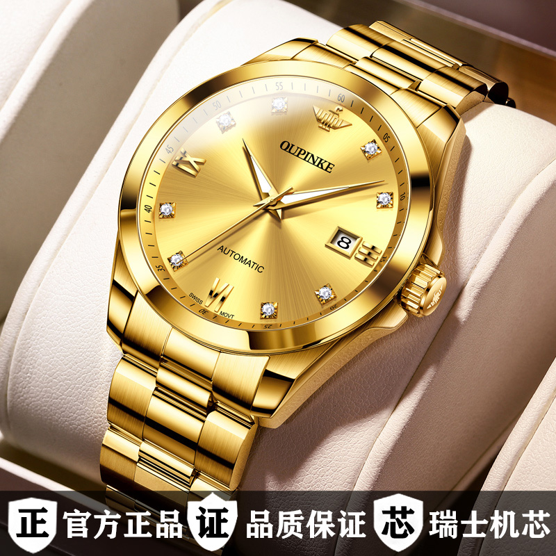 瑞士进口芯正品牌男士手表男款商务机械表男全自动真钻18K黄金色