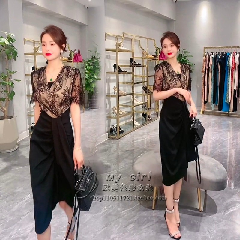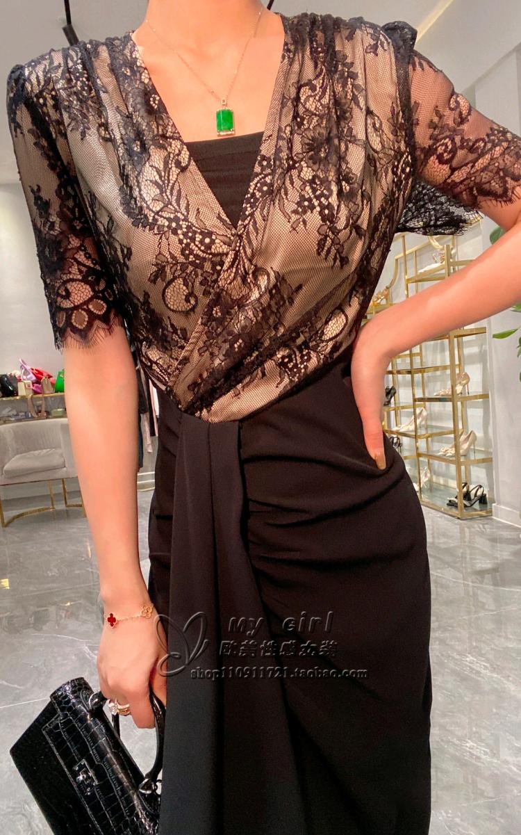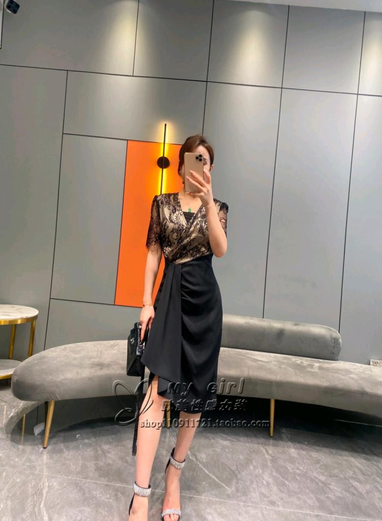 正版连衣裙女2024夏收腰显瘦蕾丝拼接气质v领温柔风小个子连衣裙