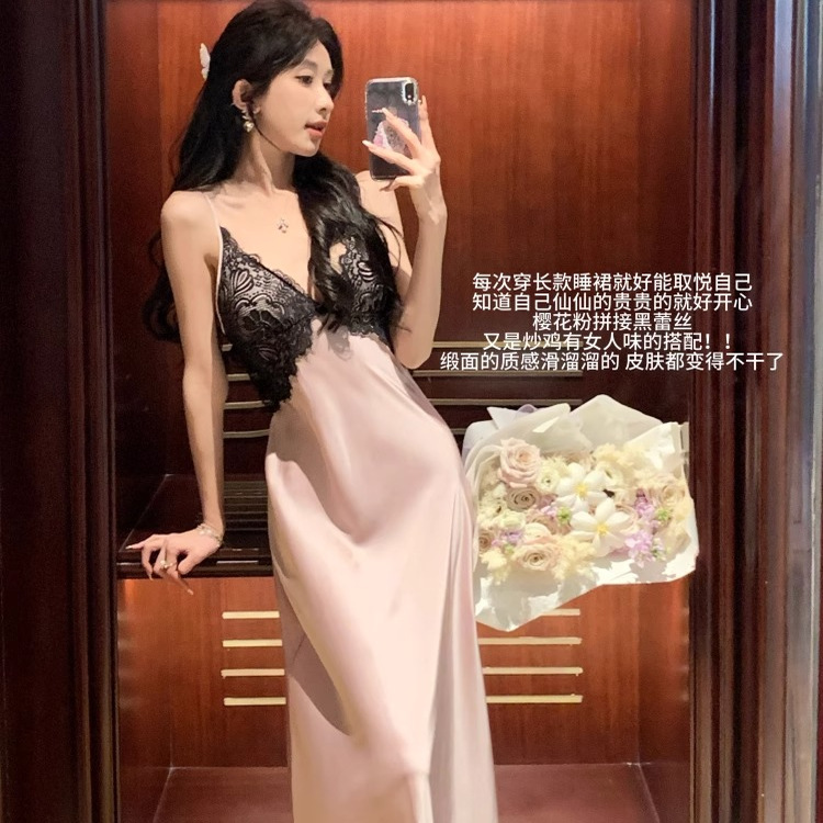 法式真丝吊带睡衣女性感长裙蕾丝带胸垫桑蚕丝睡裙家居服晨袍套装