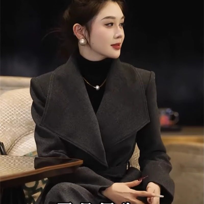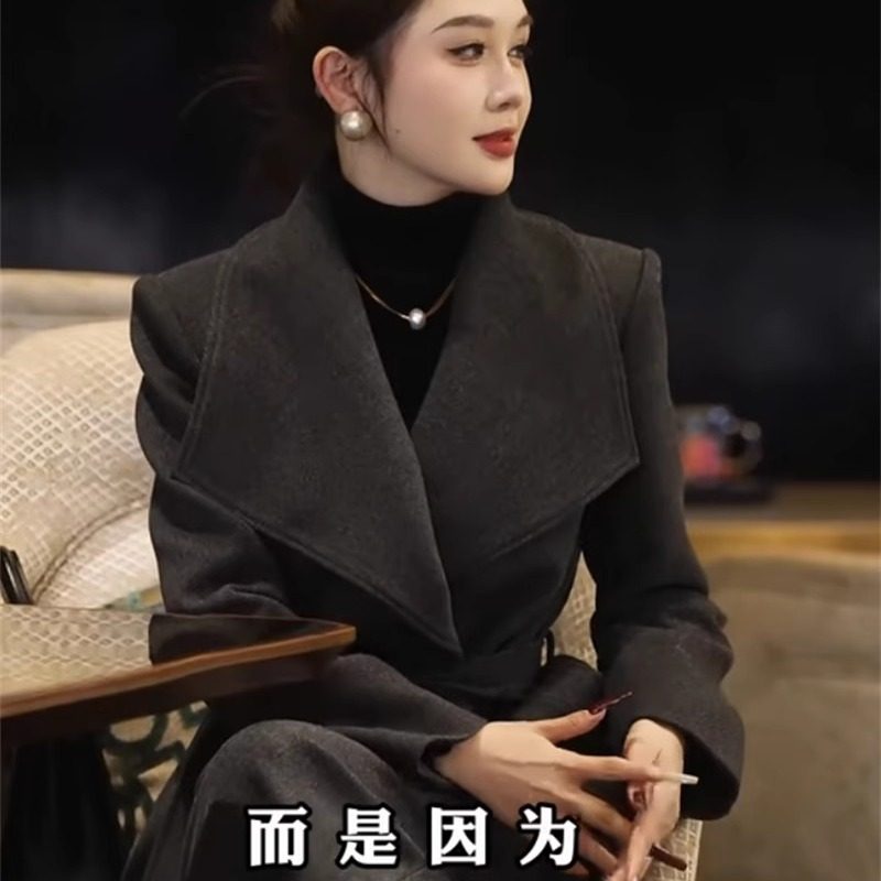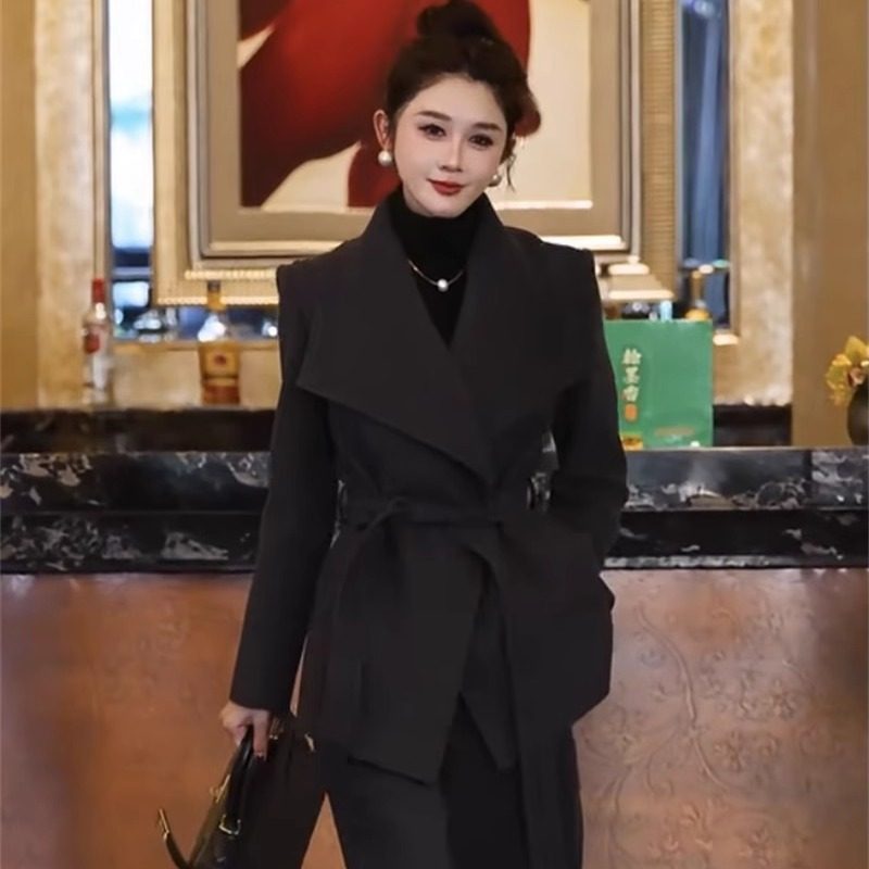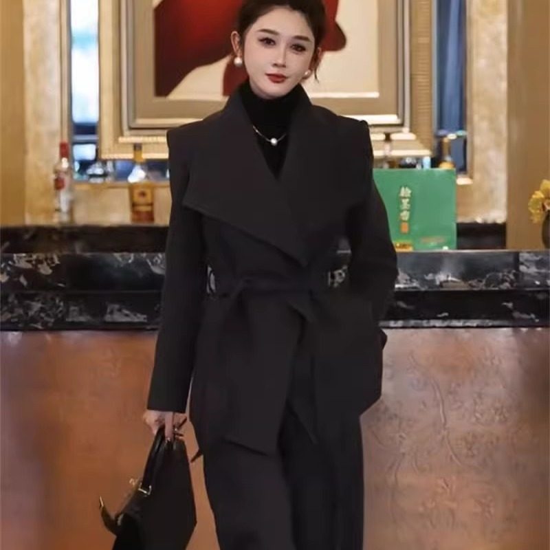 法式轻奢2025春季爆款女装黑色优雅典雅翻领韩系系带风衣收腰长裤