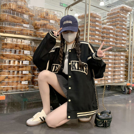 美式复古黑色棒球服外套女春秋季