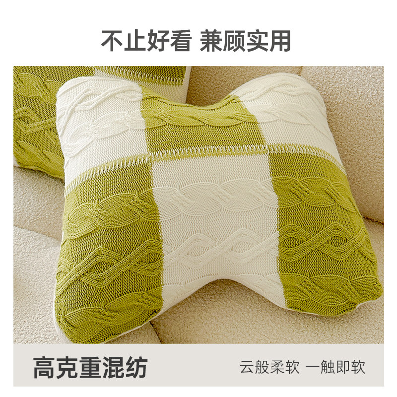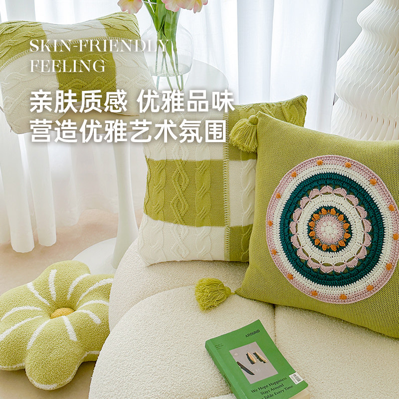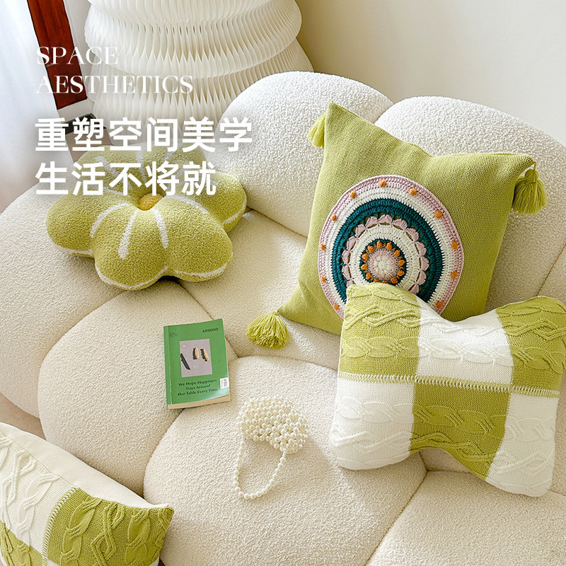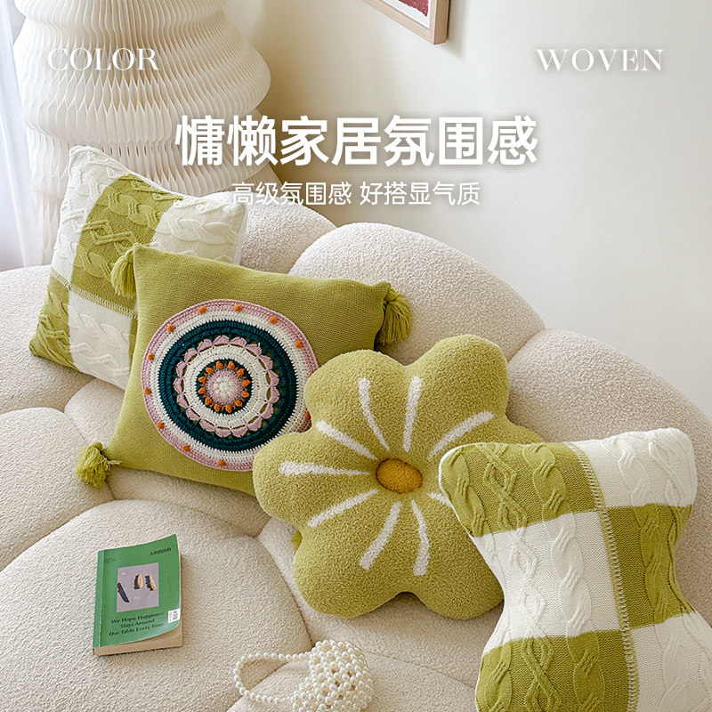 可爱毛绒太阳花抱枕含芯浅绿色系拼接卧室飘窗靠枕轻奢样板间靠垫