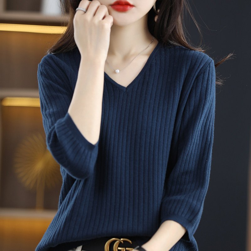 纯棉线半袖V领打底针织衫女套头中袖毛衣韩版宽松上衣短款春秋夏