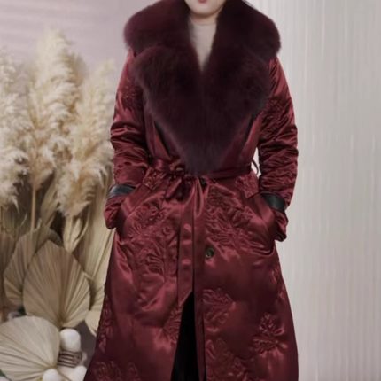 狐狸毛领鹅绒服中长缎面提花醋酸羽绒服妈妈外套230长111