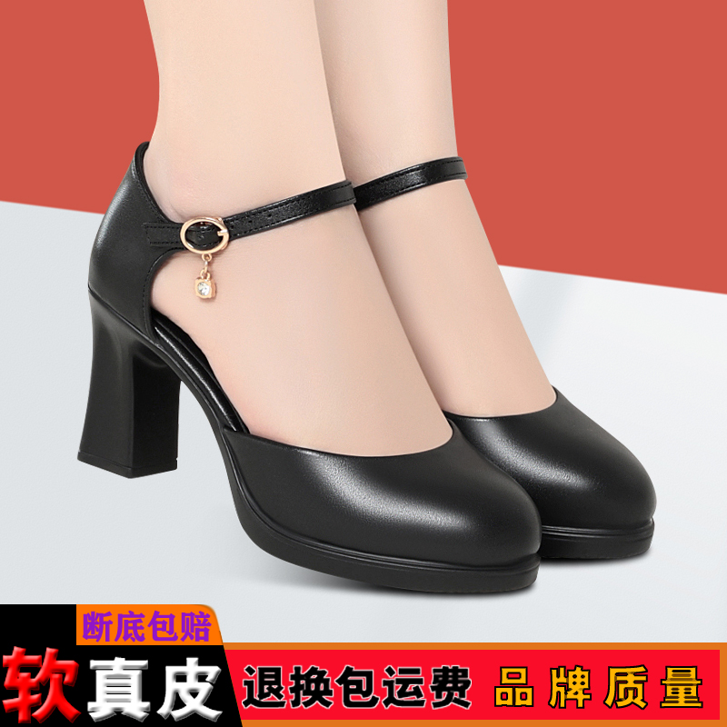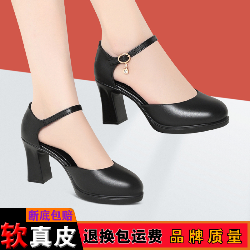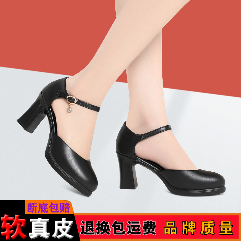 洋气百搭粗跟皮鞋轻便透气耐磨通勤鞋夏季走秀高跟鞋一字带女凉鞋