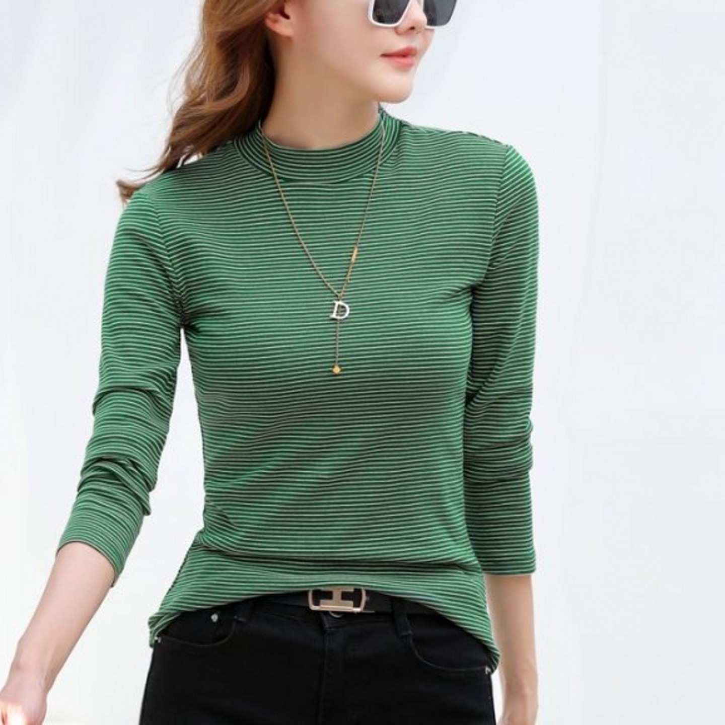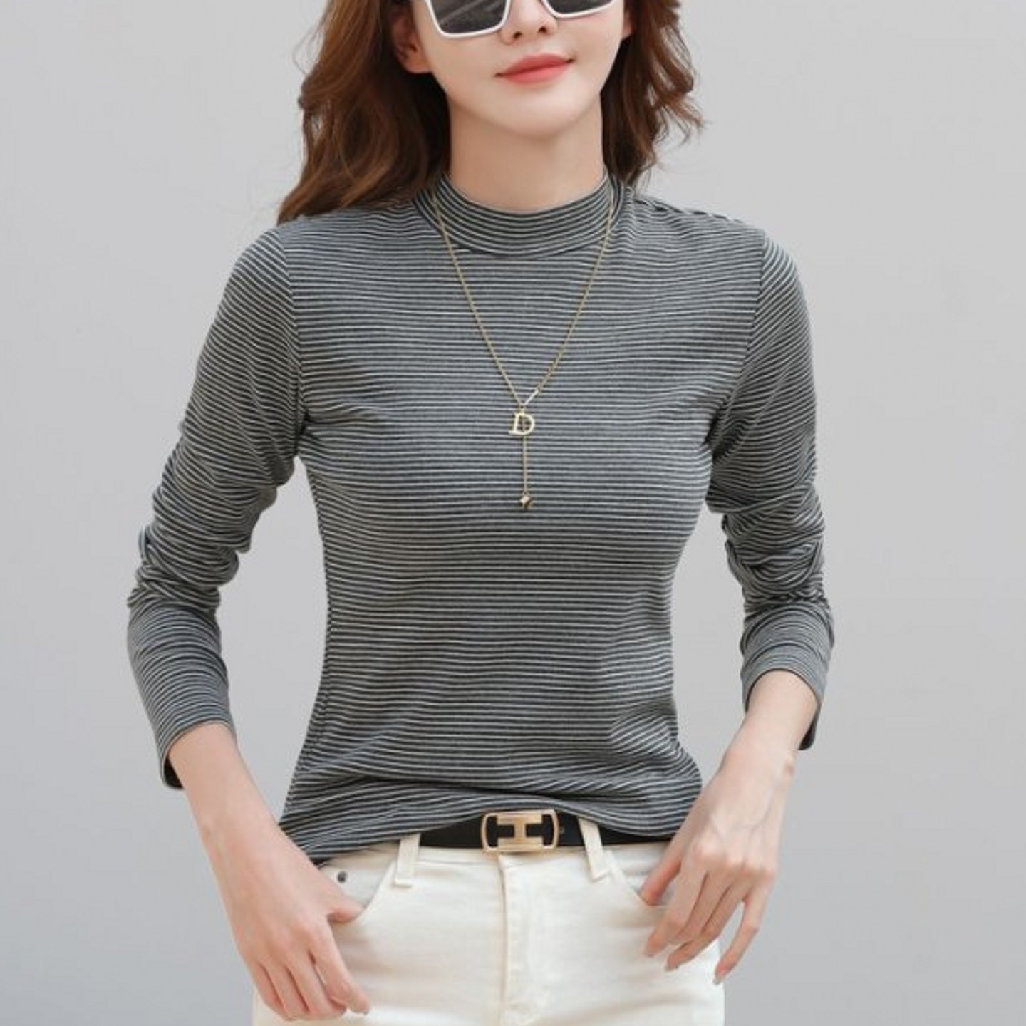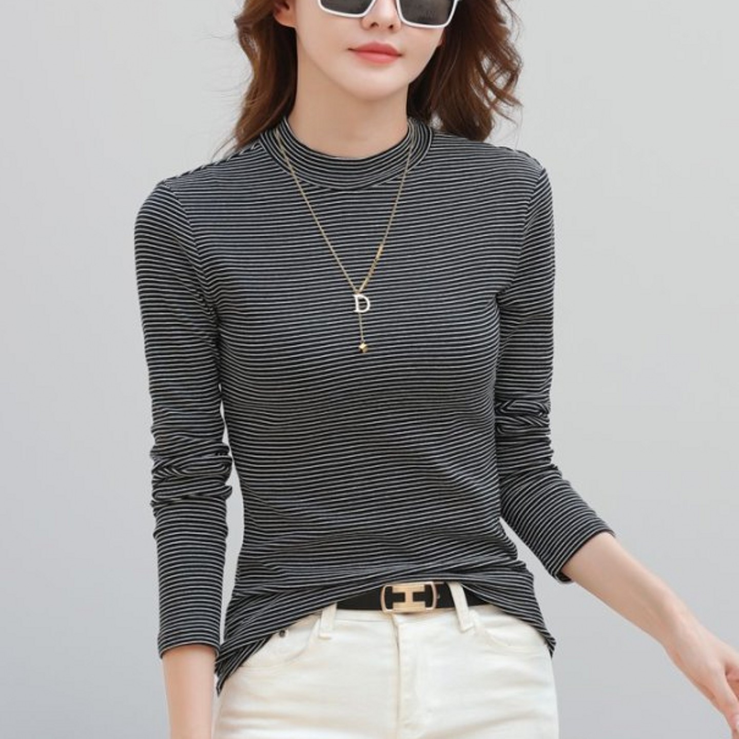 条纹半高领打底衫女内搭春秋冬新款长袖t恤百搭保暖中领上衣小衫