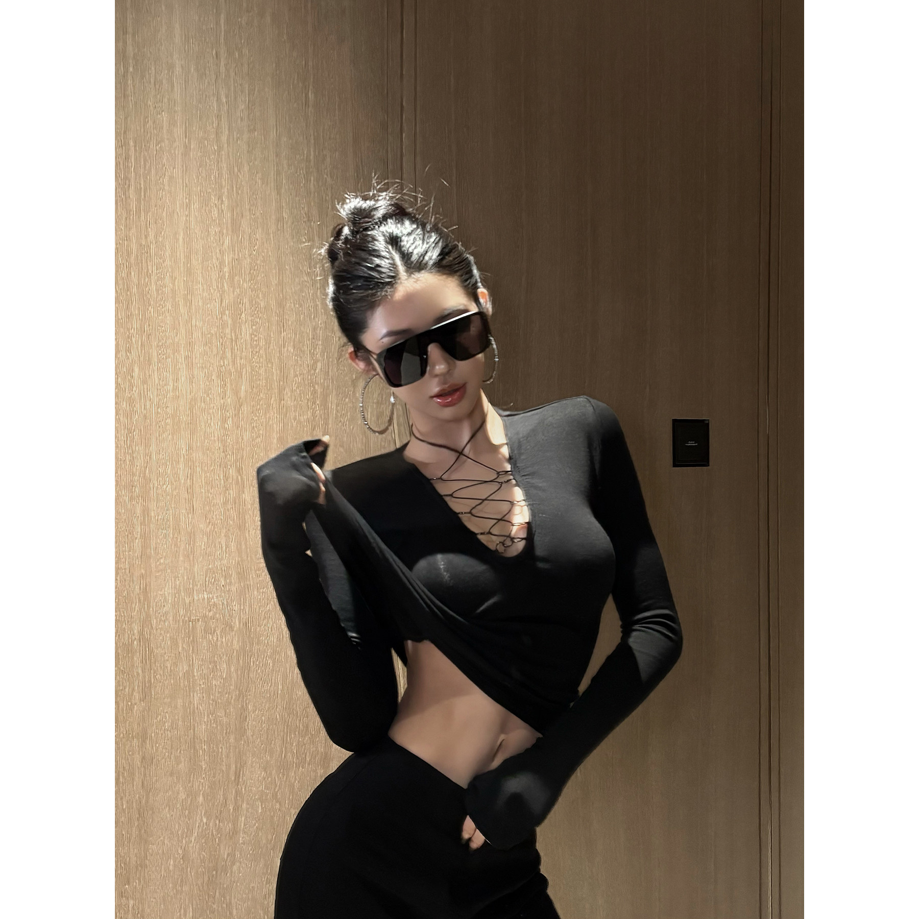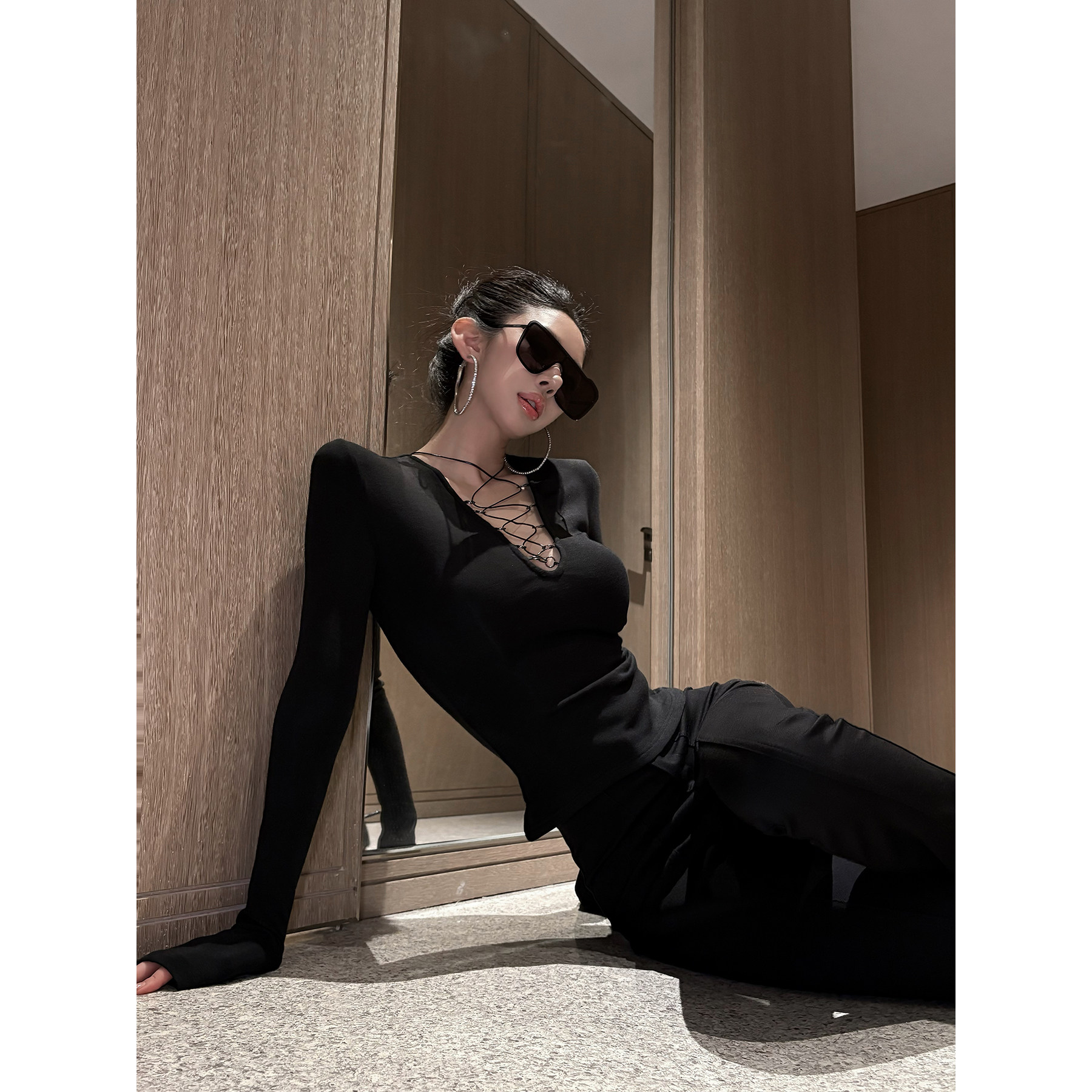 福尔尼斯悦 V领长袖上衣女2025冬季新款绑带性感内搭T恤打底衫黑
