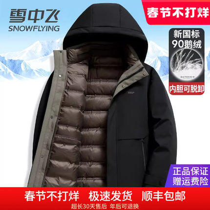 雪中飞男士羽绒服连帽加厚内胆可脱卸鹅绒服中老年爸爸装冬季外套