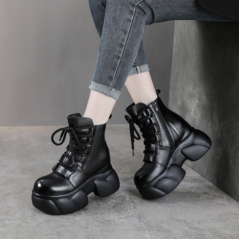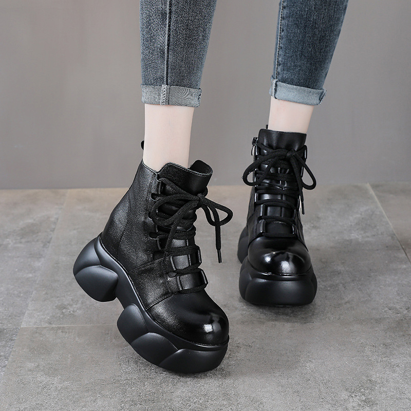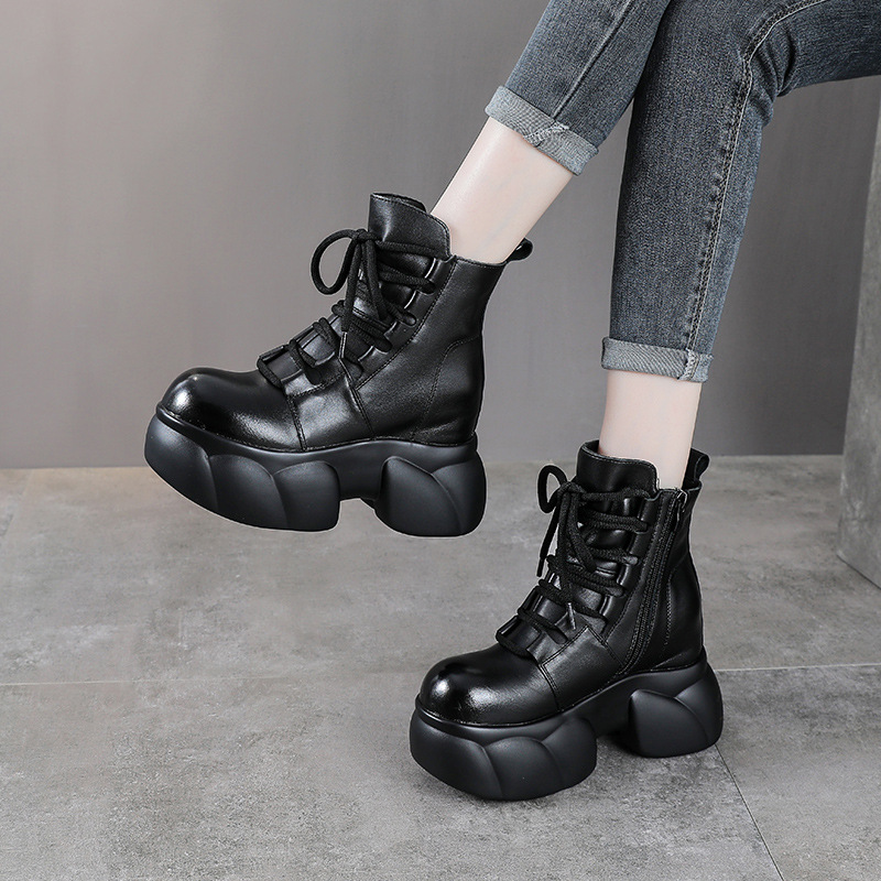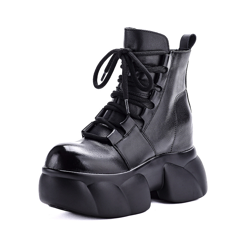 真皮厚底增高小个子马丁靴女2025秋冬新款头层牛皮系带显脚小短靴