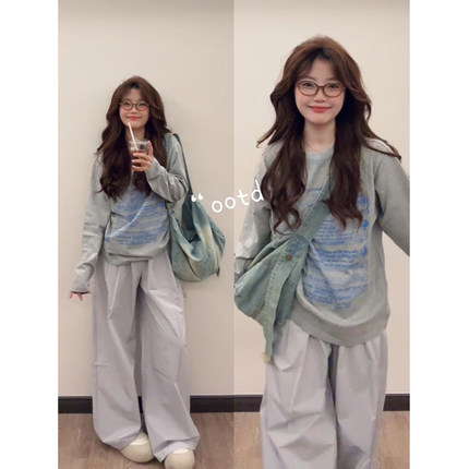 设计感字母印花小众灰色长袖t恤女春秋季薄款显瘦宽松打底上衣