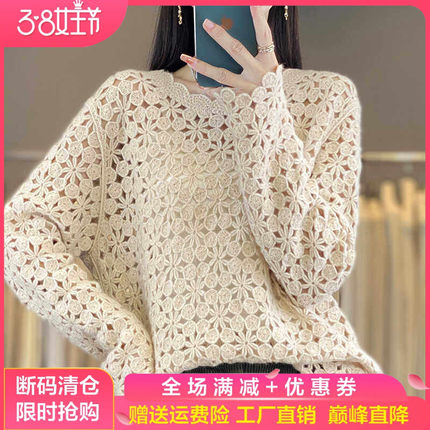 刺绣镂空100%纯羊毛衫女圆领钩花长袖针织毛衣宽松羊绒衫打底上衣