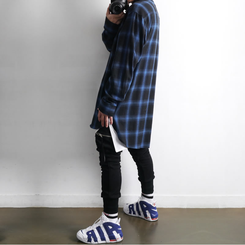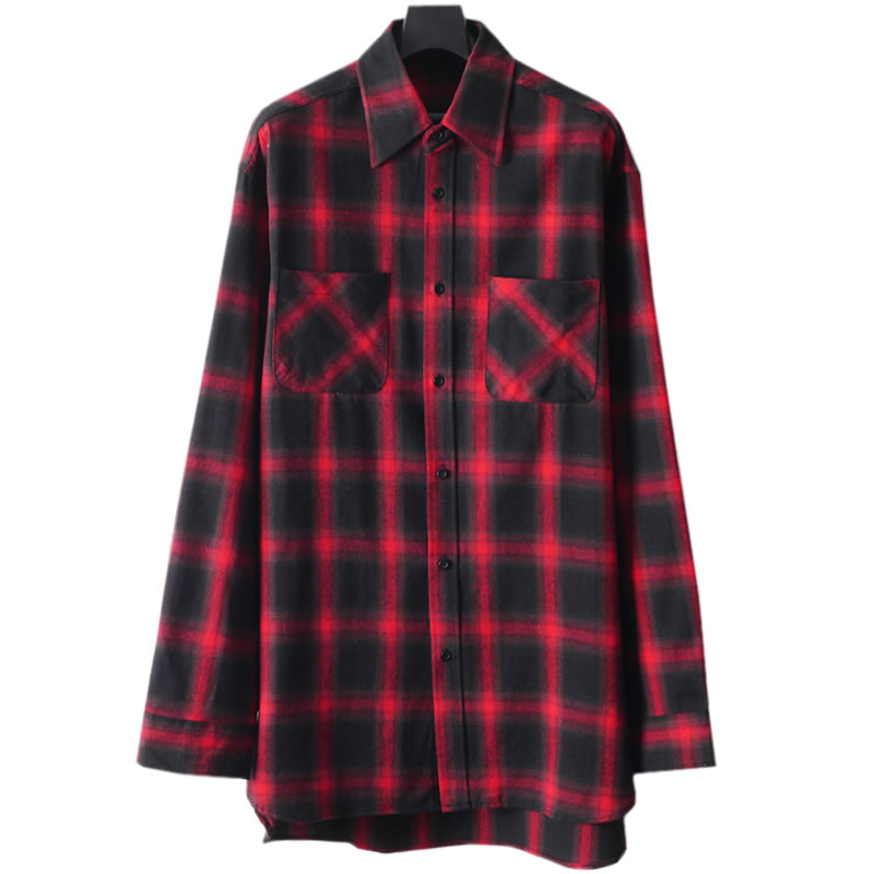 蓝色街头格子衬衫男潮牌宽松嘻哈长款韩版潮春秋长袖男生衬衣薄款