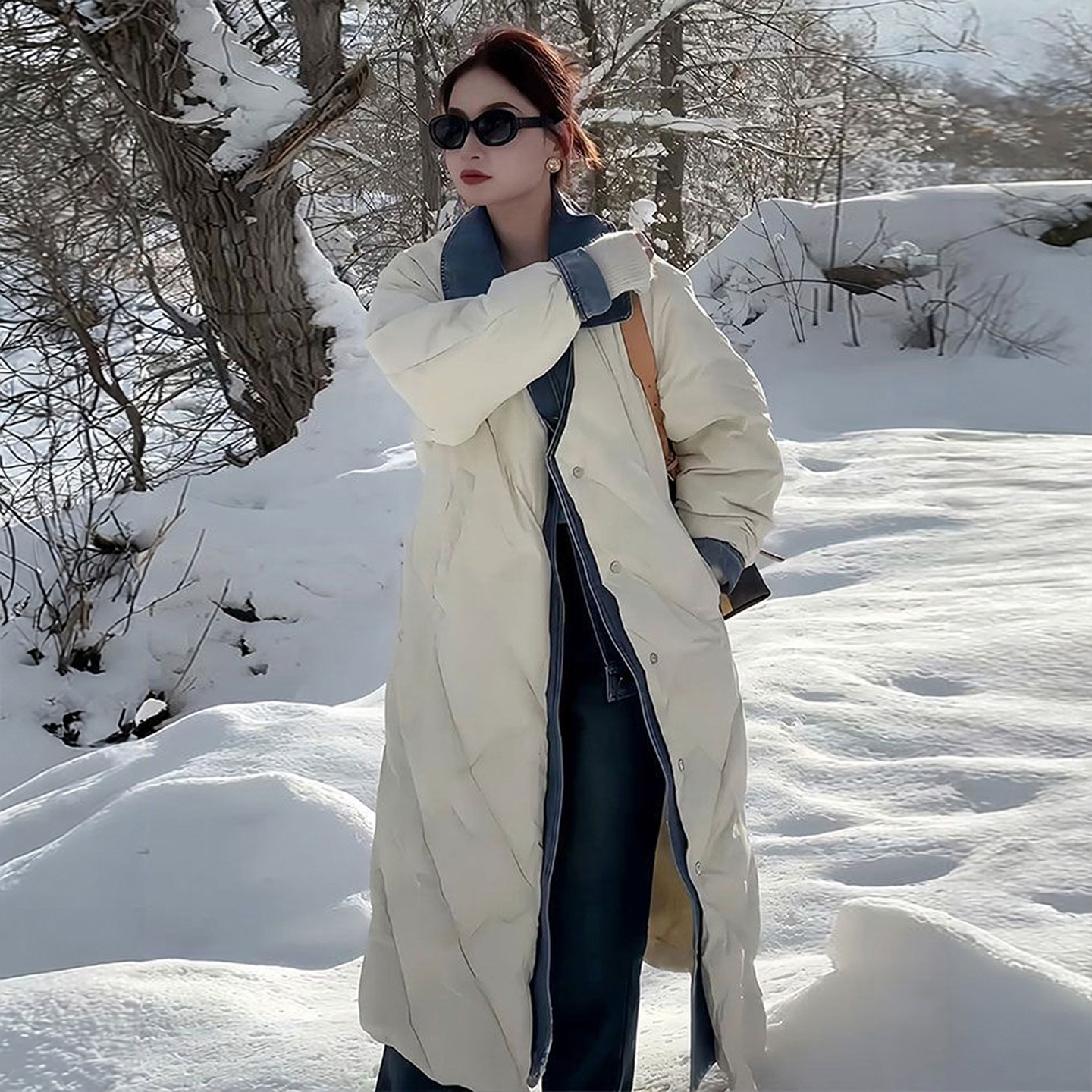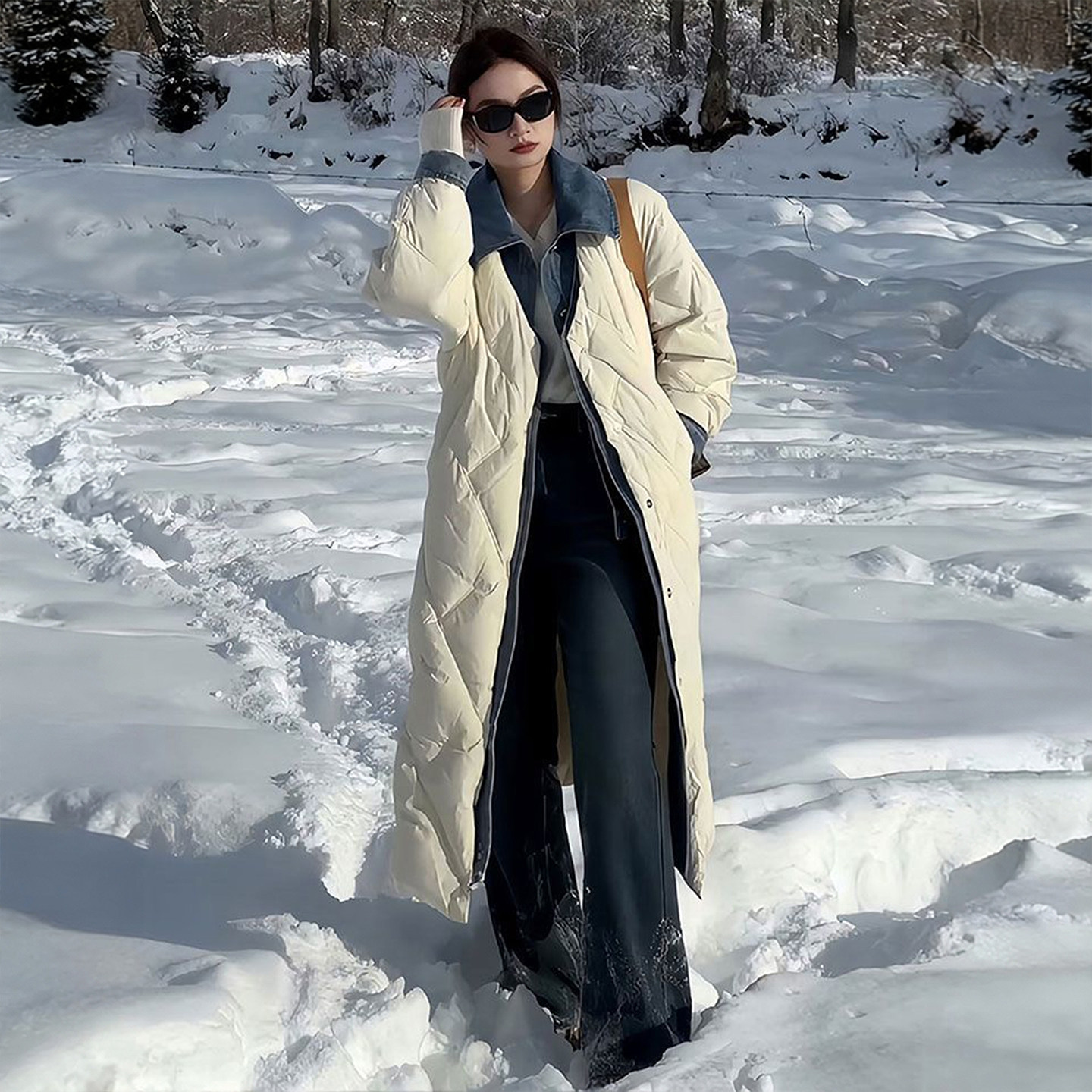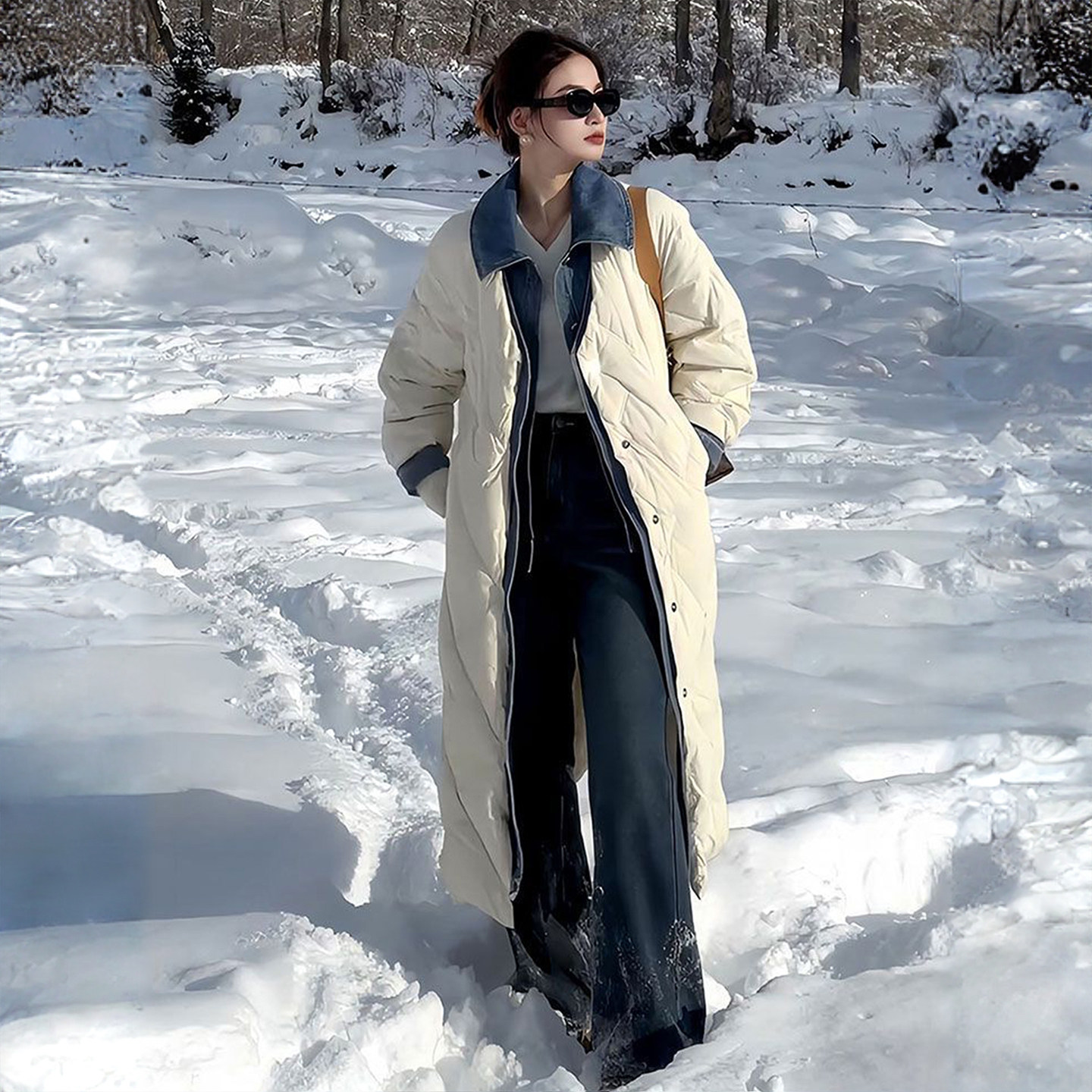 300斤大码女装韩版宽松牛仔拼接棉服女胖mm设计感宽松过膝外套潮