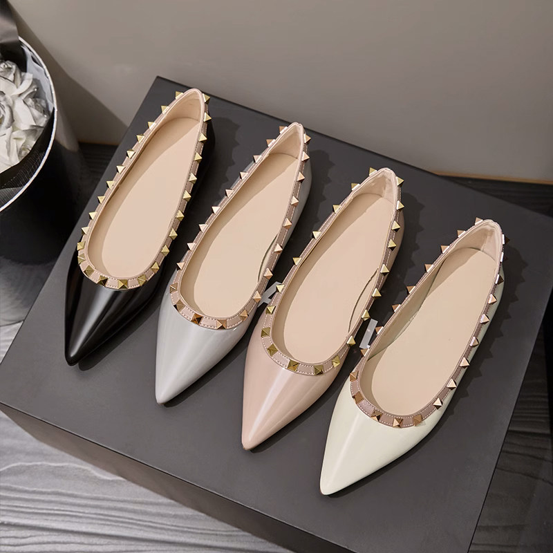 尖头铆钉单鞋女法式气质漆皮外穿柳丁瓢鞋晚晚风温柔裸色平底鞋女