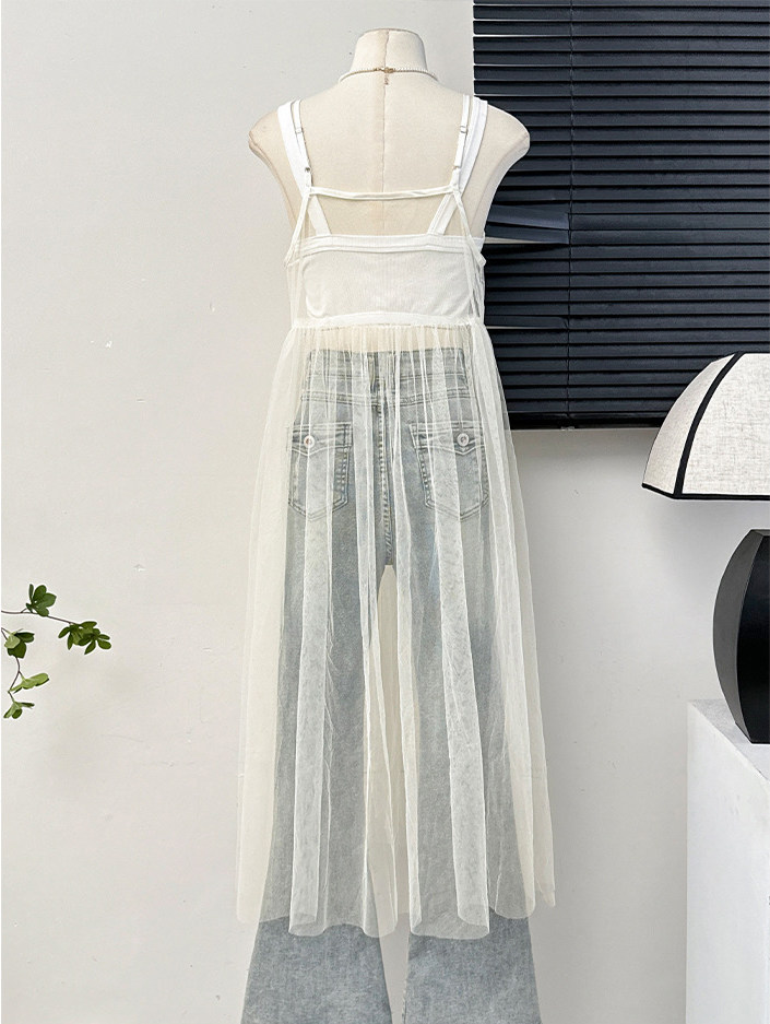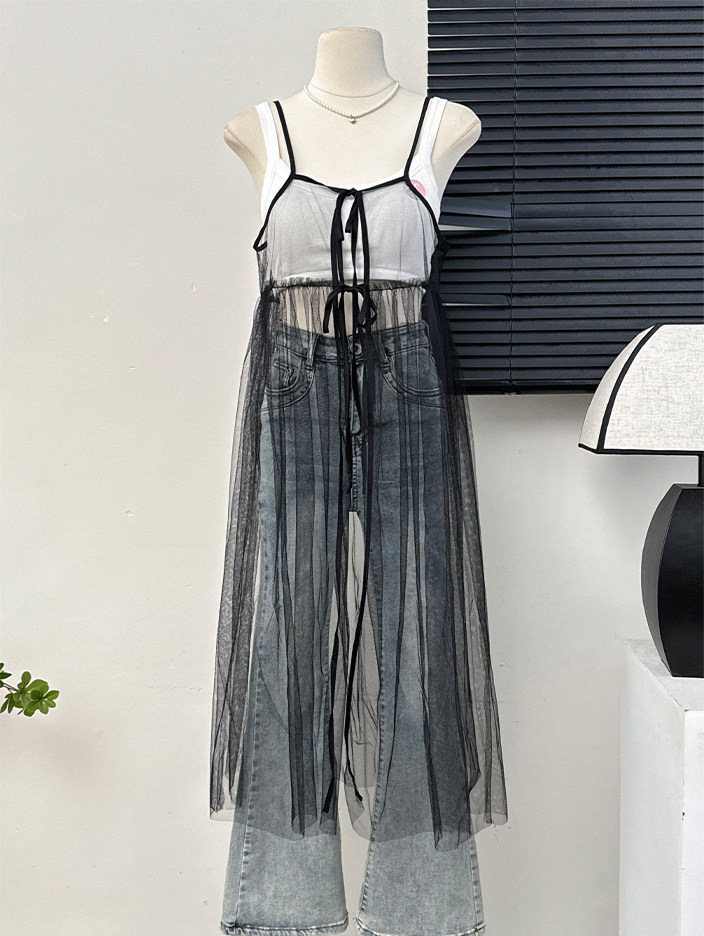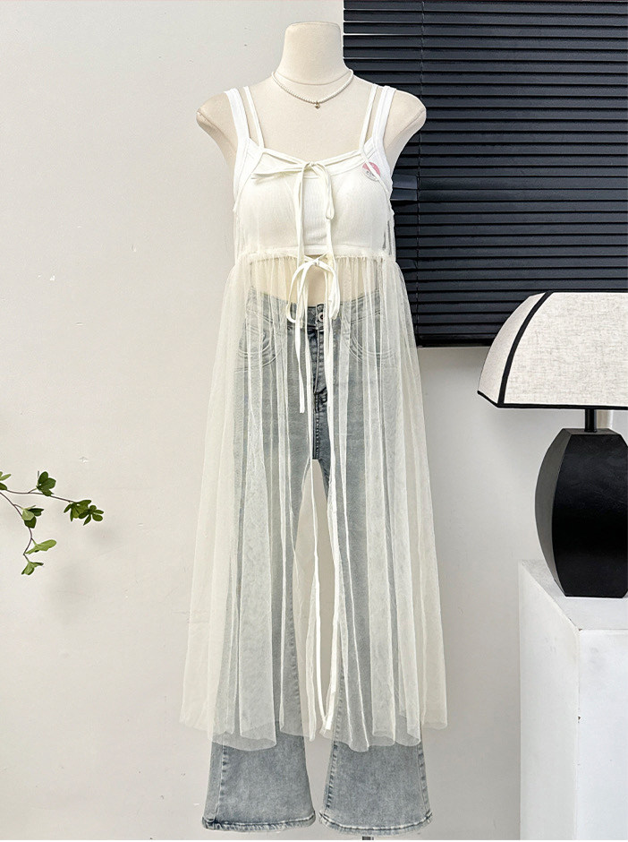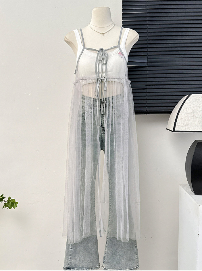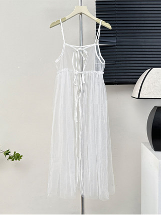 蝴蝶结系带镂空网纱吊带连衣裙女夏海边度假风外搭叠穿开叉罩衫裙