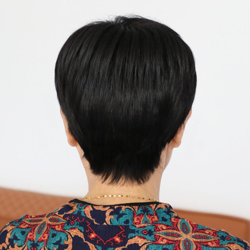 中老年假发女黑色短发真发头套全真自然50岁妈妈化疗光头假头发薄