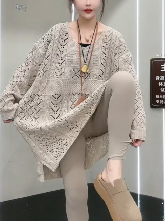 欧货定制2024秋季新款显瘦百搭V领套头镂空中长款针织衫上衣女潮