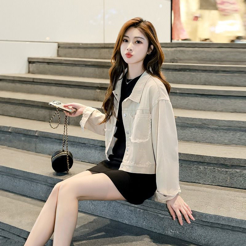 港风杏色休闲短款牛仔外套女2025春秋新款设计感口袋流苏夹克上衣