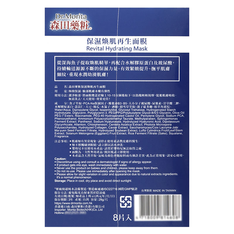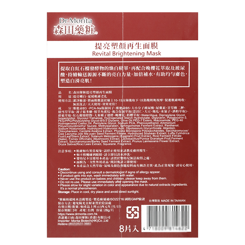 香港万宁购 森田药妆提亮塑颜再生玻尿酸面膜8片保湿补水提亮嫩白