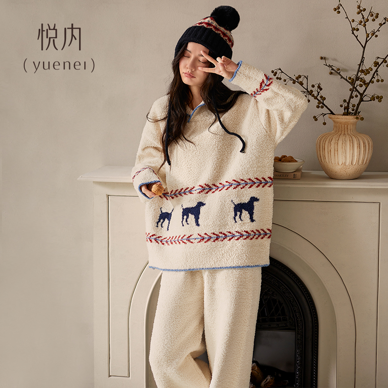 悦内半边绒睡衣女款秋冬季珊瑚绒家居服复古费尔岛可外穿保暖套装