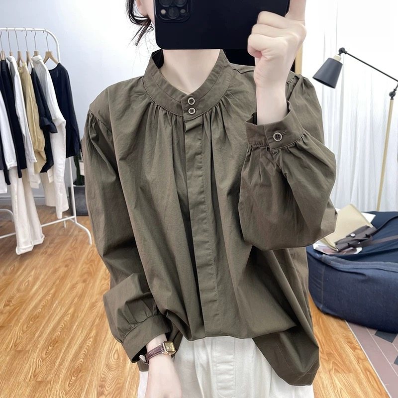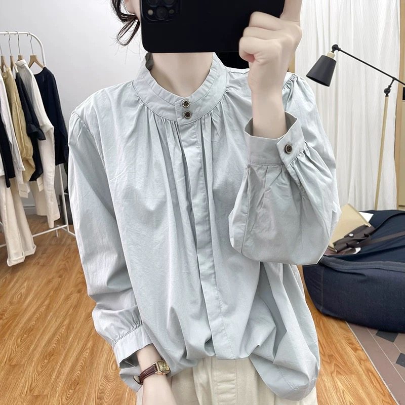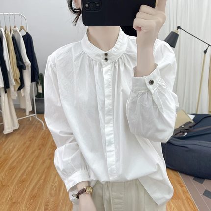 复古立领纯棉长袖衬衫女打底上衣