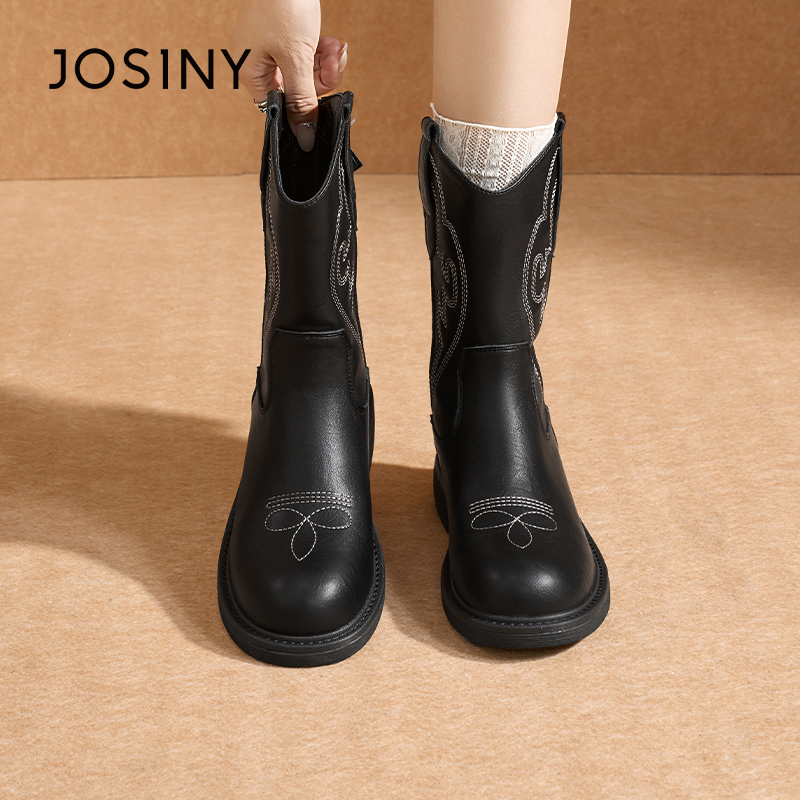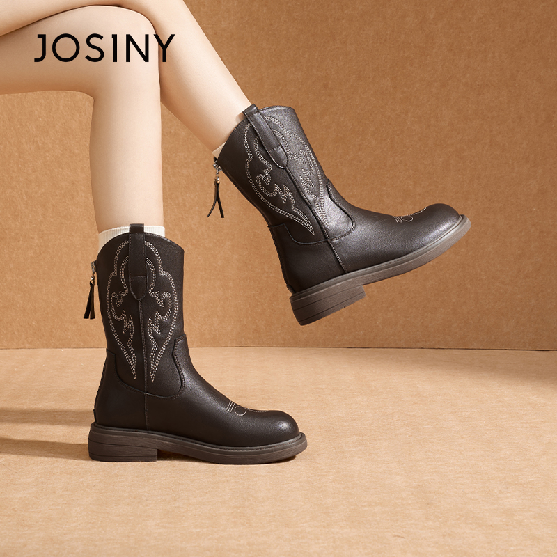 卓诗尼西部牛仔靴女2025冬季新款粗跟复古刺绣短靴子百搭马丁靴子