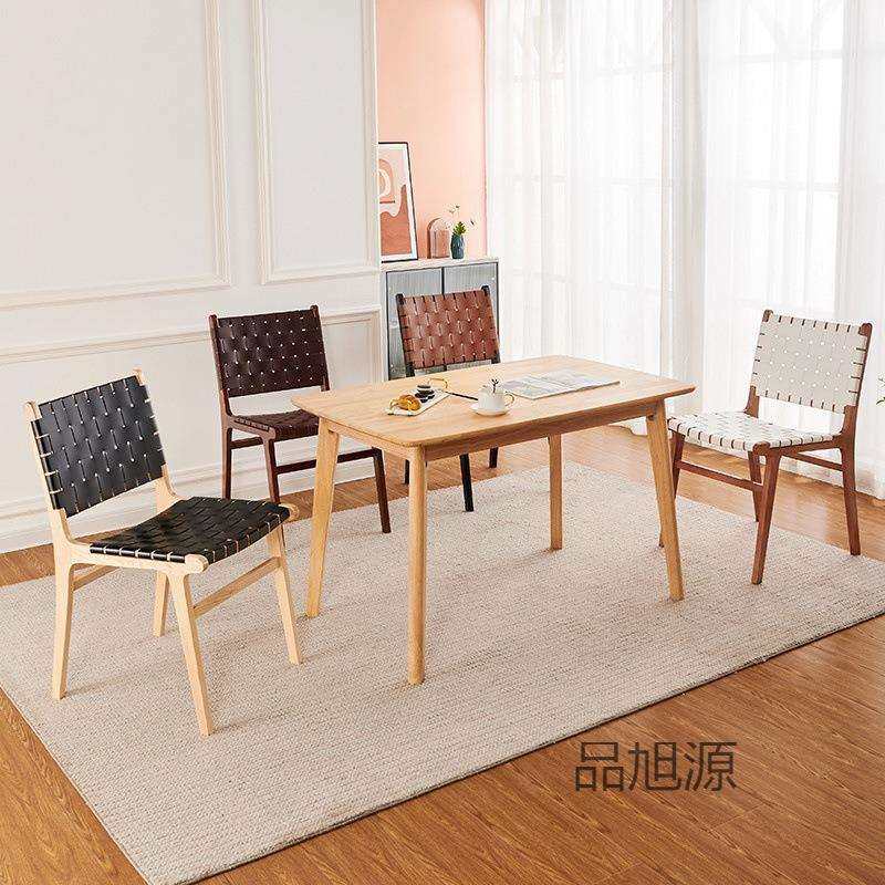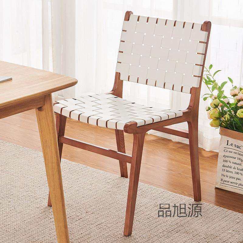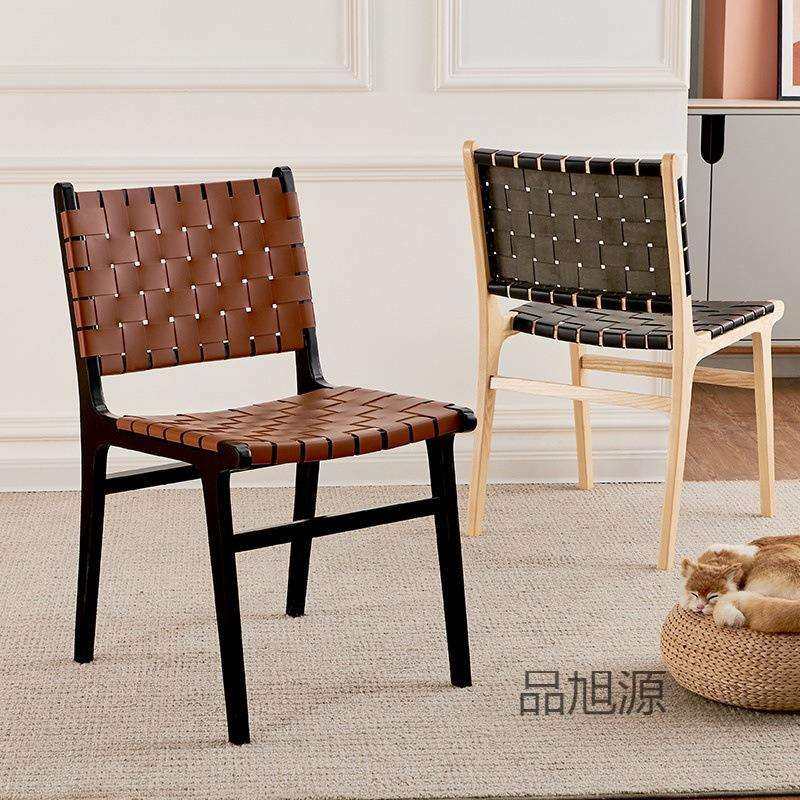 北欧实木马鞍皮餐椅日式家用复古藤编椅子咖啡店设计师靠背椅凳子
