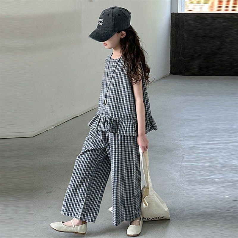 小女孩韩版休闲套装夏季女大童阔腿棉布两件套女童荷叶边夏装洋气