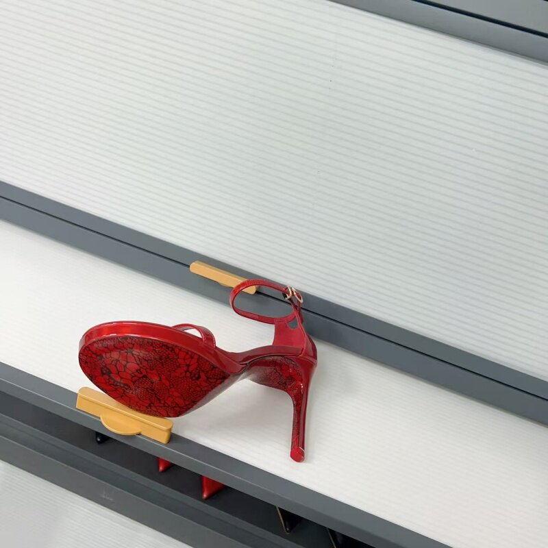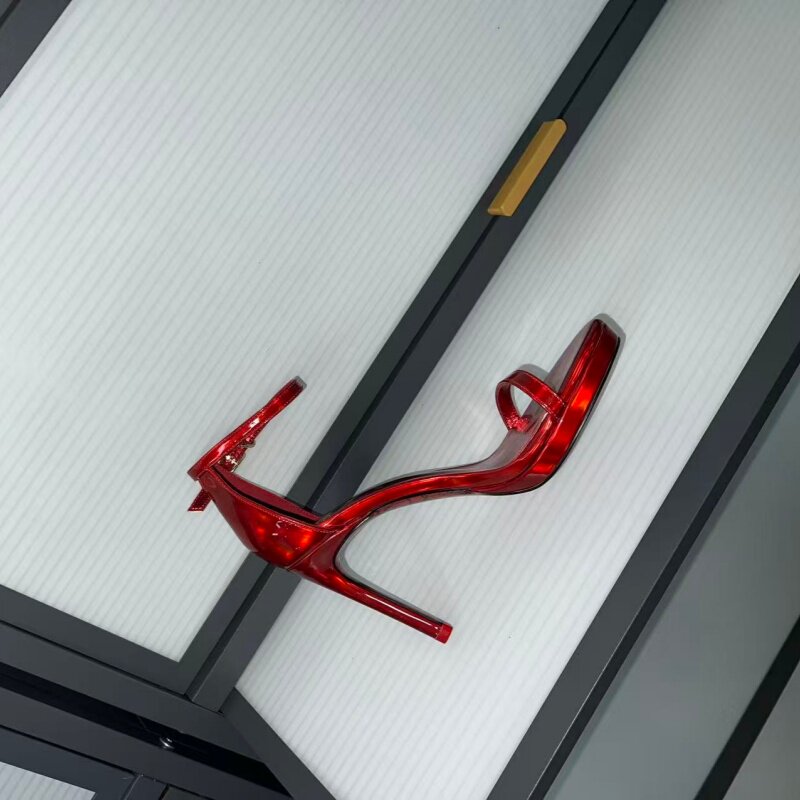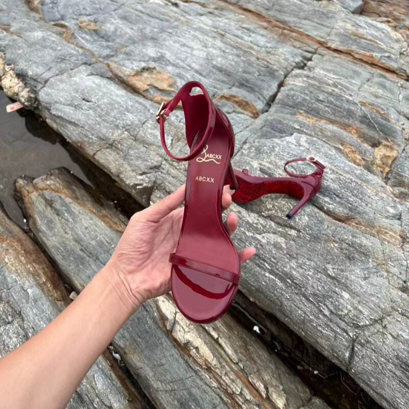 2026夏季性感露趾一字带漆皮红色蛇纹底百搭镭射红酒红色高跟凉鞋