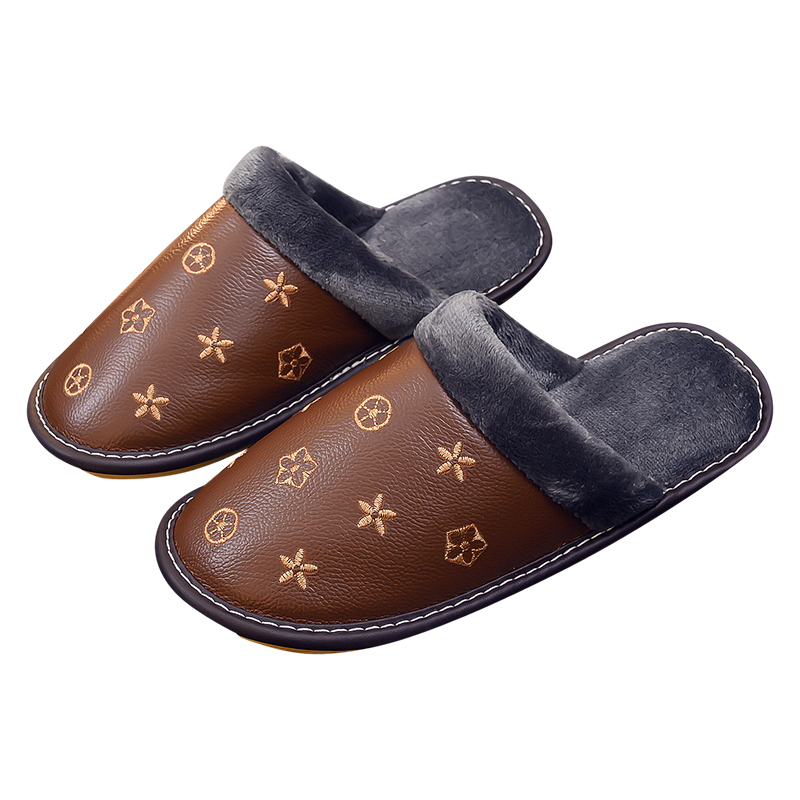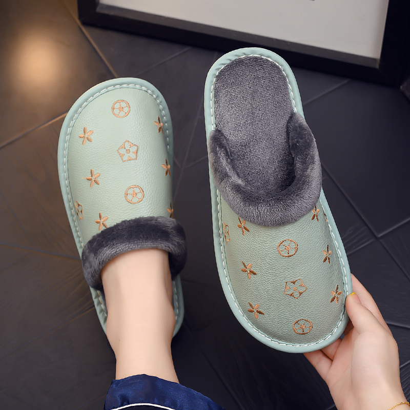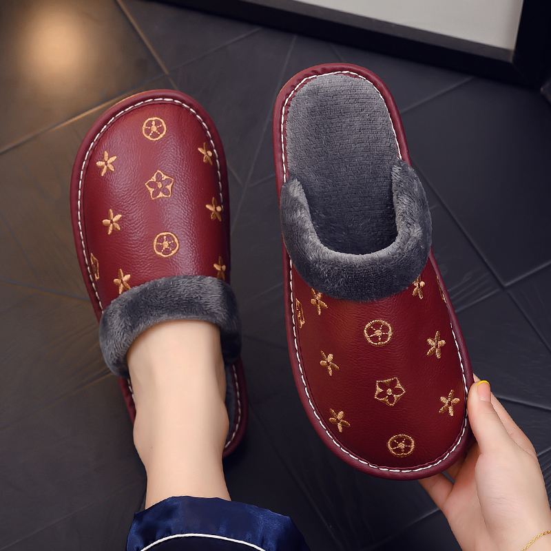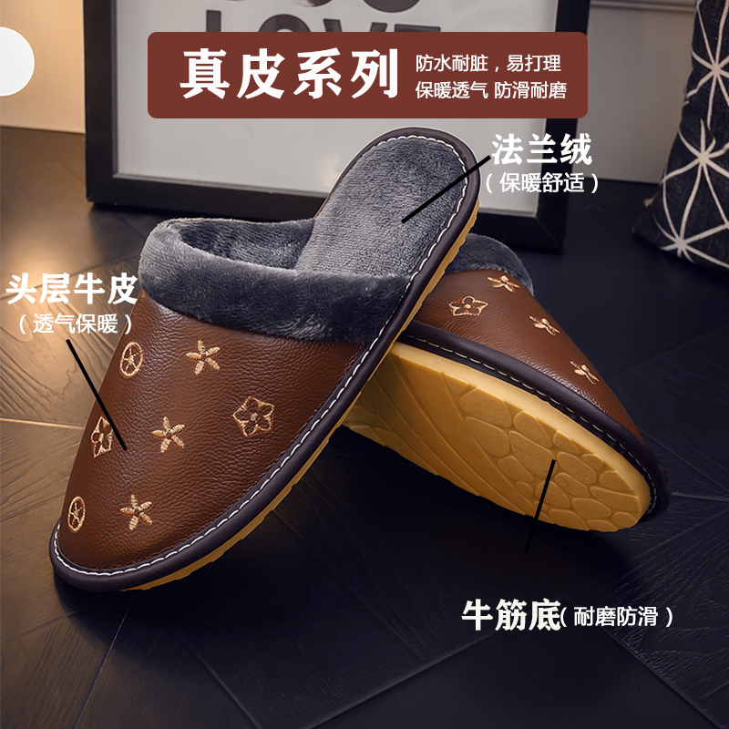 真牛皮面情侣家用防滑防水牛筋厚底毛绒棉拖鞋女秋冬季家居男室内