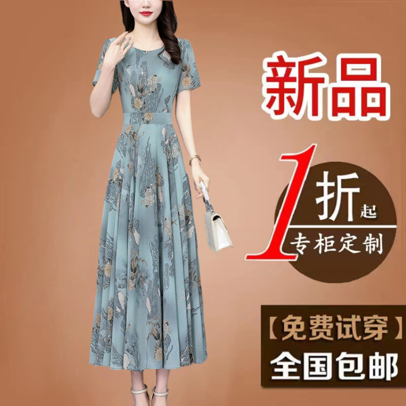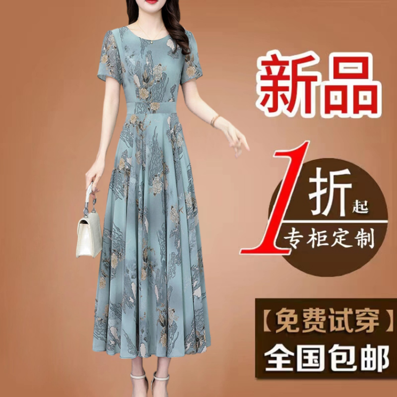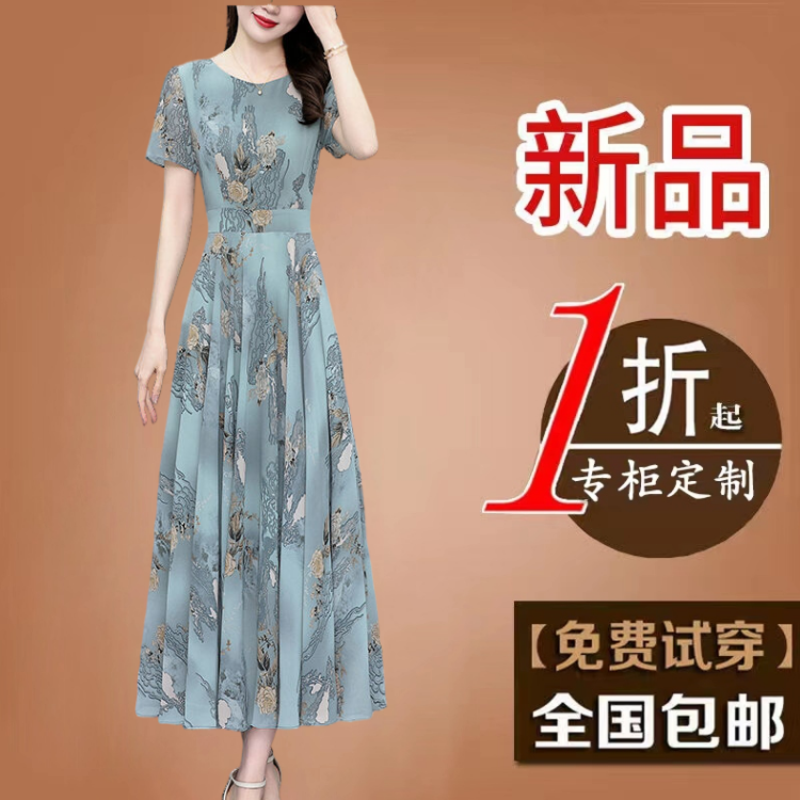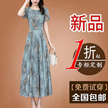 高贵妈妈装减龄女装真丝碎花连衣裙2025新款夏季短袖大码雪纺长裙