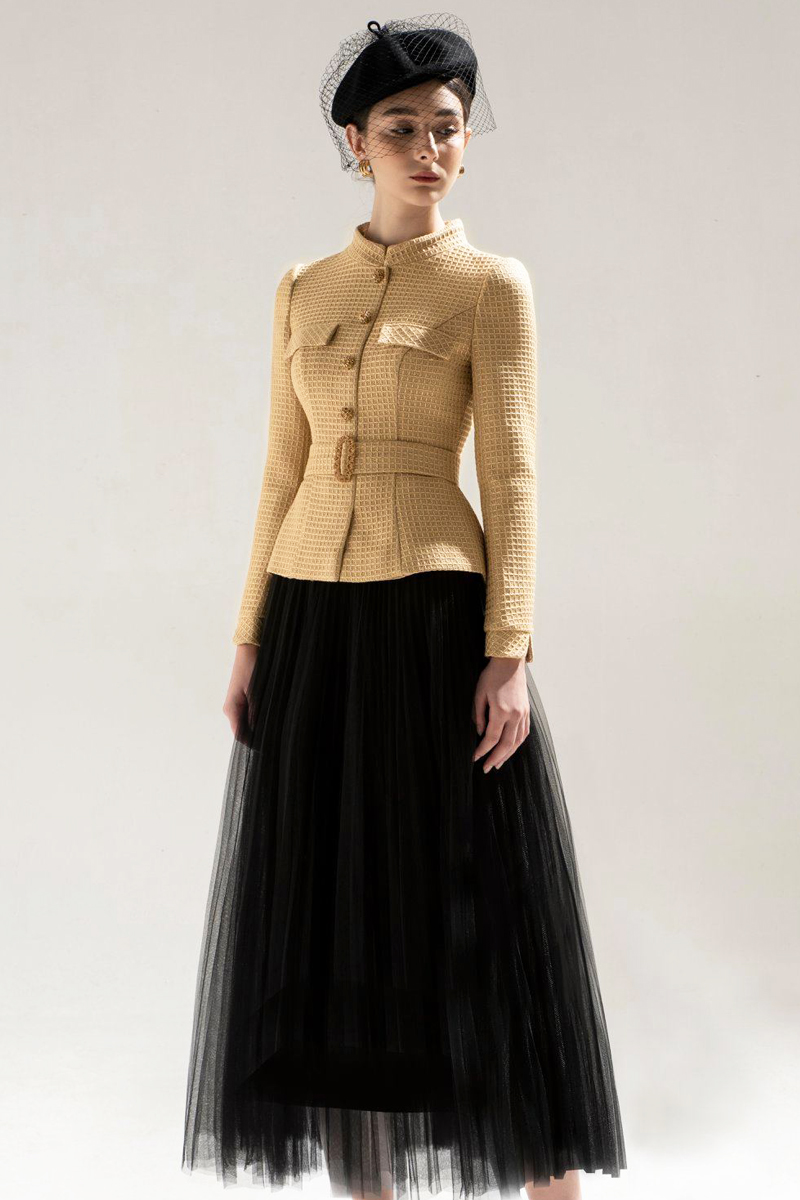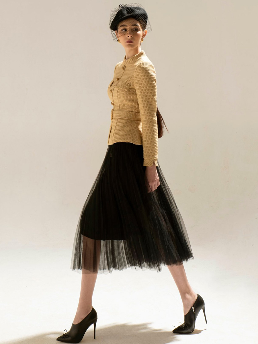 小立领长袖职场精英高档女士压褶半身裙职业西装两件套装精品上衣