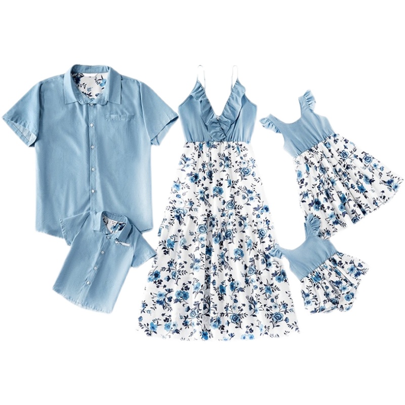 欧美纯棉亲子装夏装短袖父子牛仔衬衫母女连衣裙母子装婴儿连体裙
