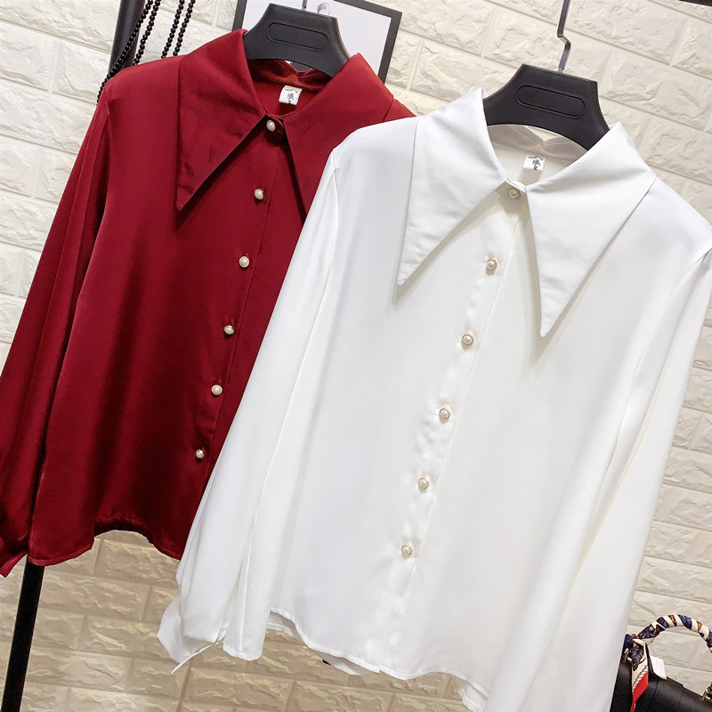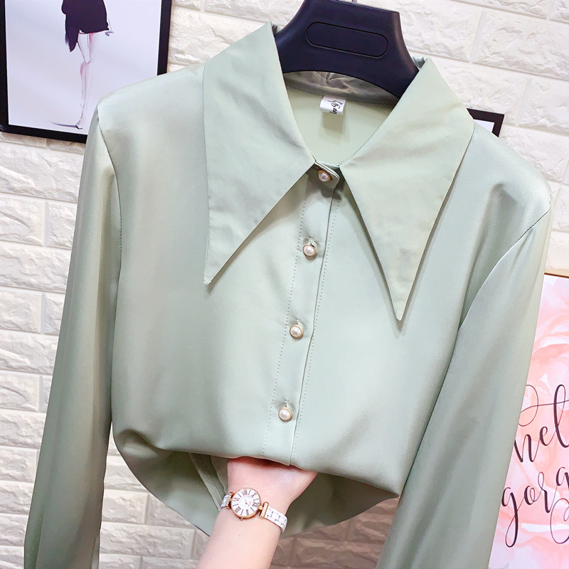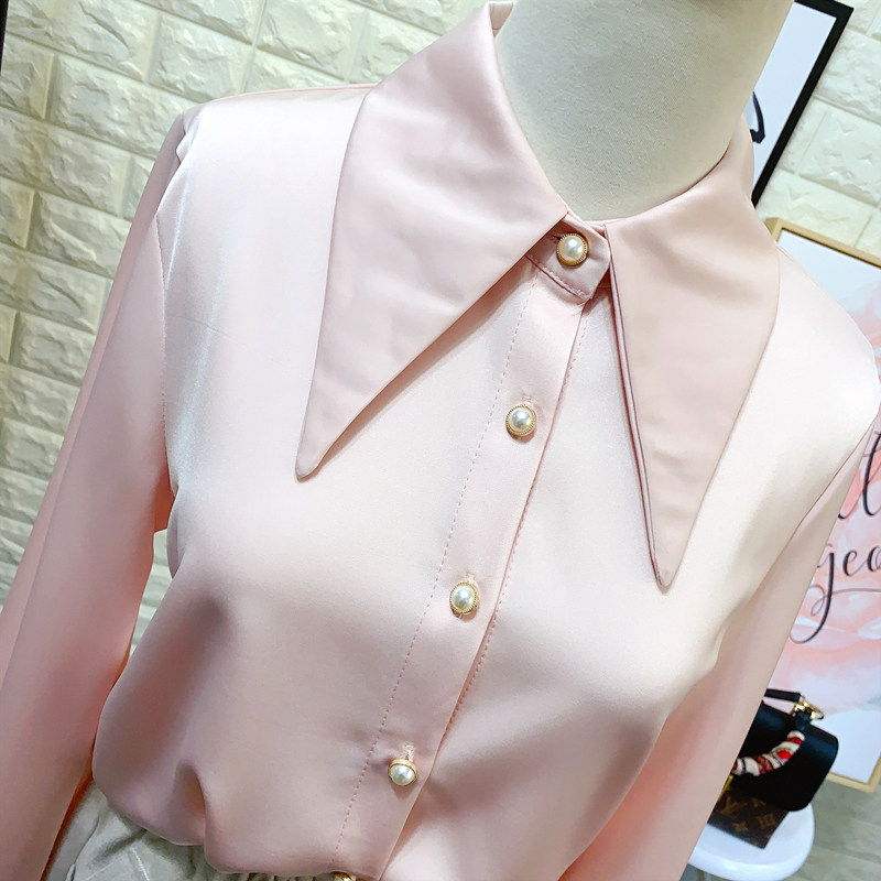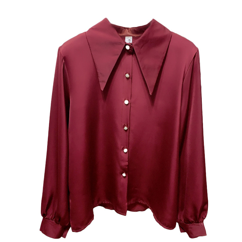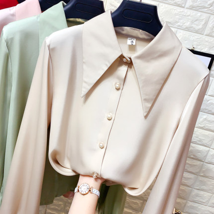 港味chic尖领醋酸缎面长袖衬衫女春装新款OL气质雪纺衬衫外穿上衣