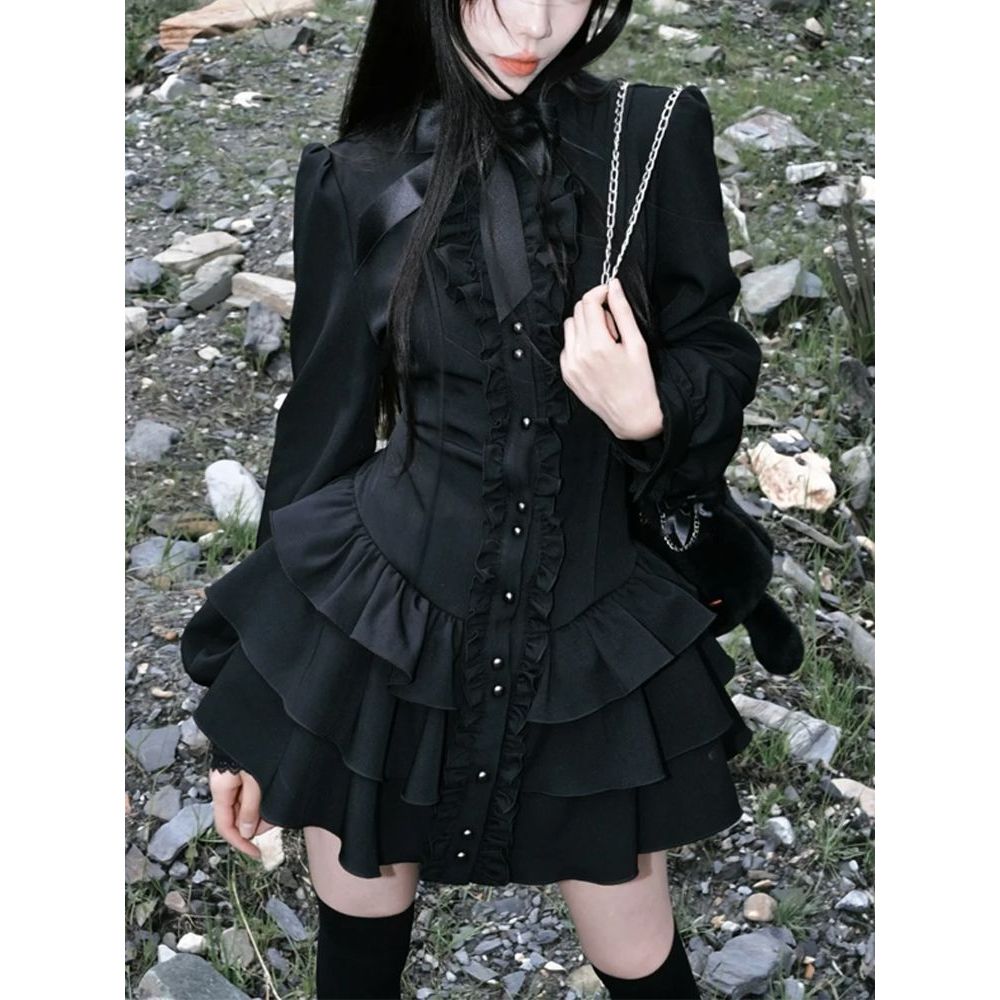 黑巧 暗黑系哥特风蝴蝶结长袖收腰连衣裙拼接木耳边蓬蓬蛋糕短裙