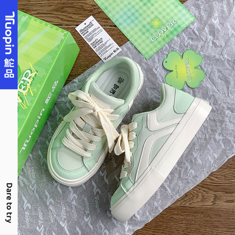 鮀品四叶草板鞋女透气夏季新款厚底帆布鞋薄荷绿色鞋子休闲运动鞋