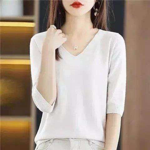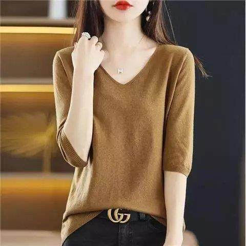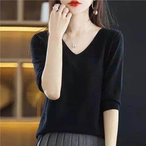 2024春秋V领套头毛衣女中袖打底衫宽松五分袖针织短袖女内搭上衣