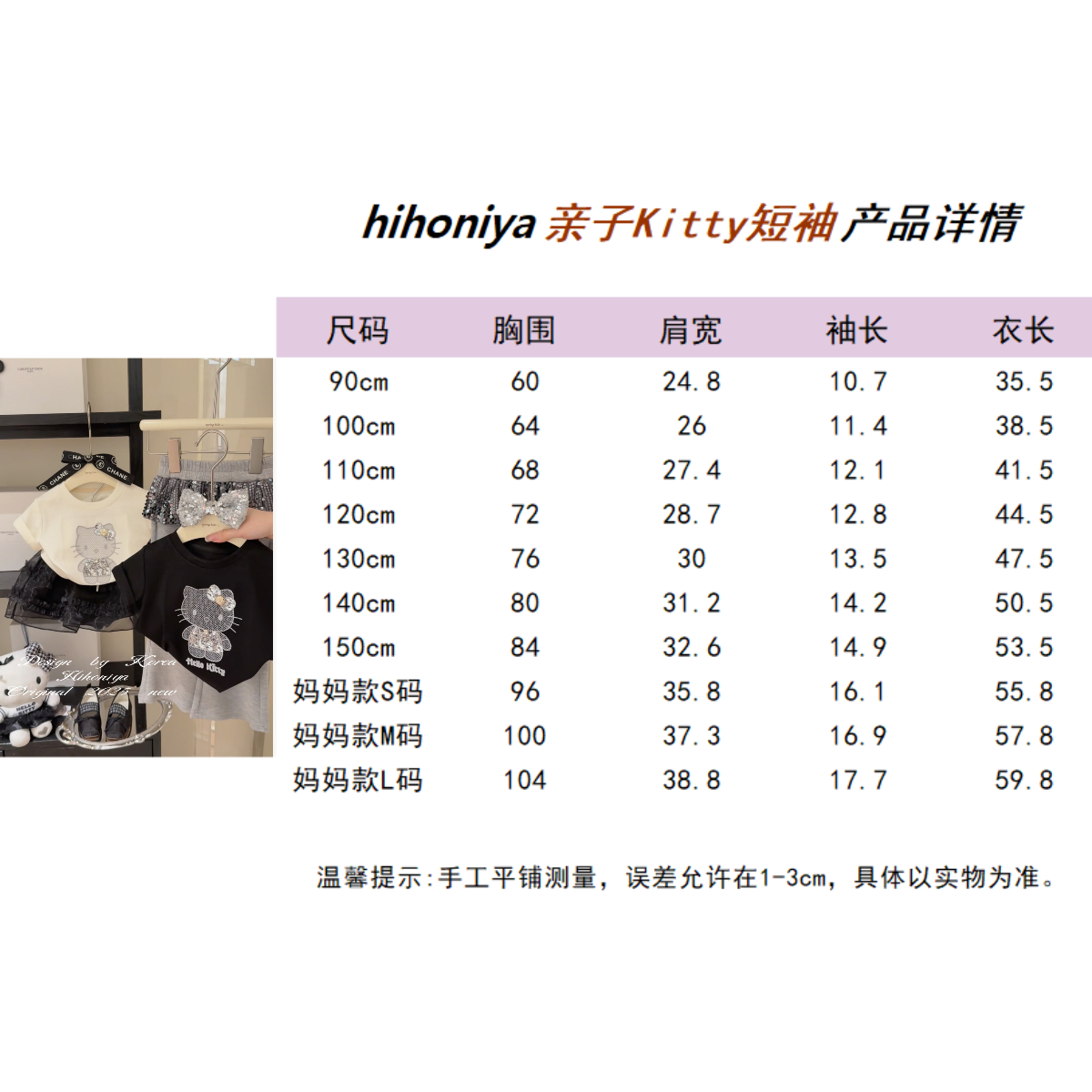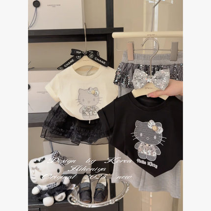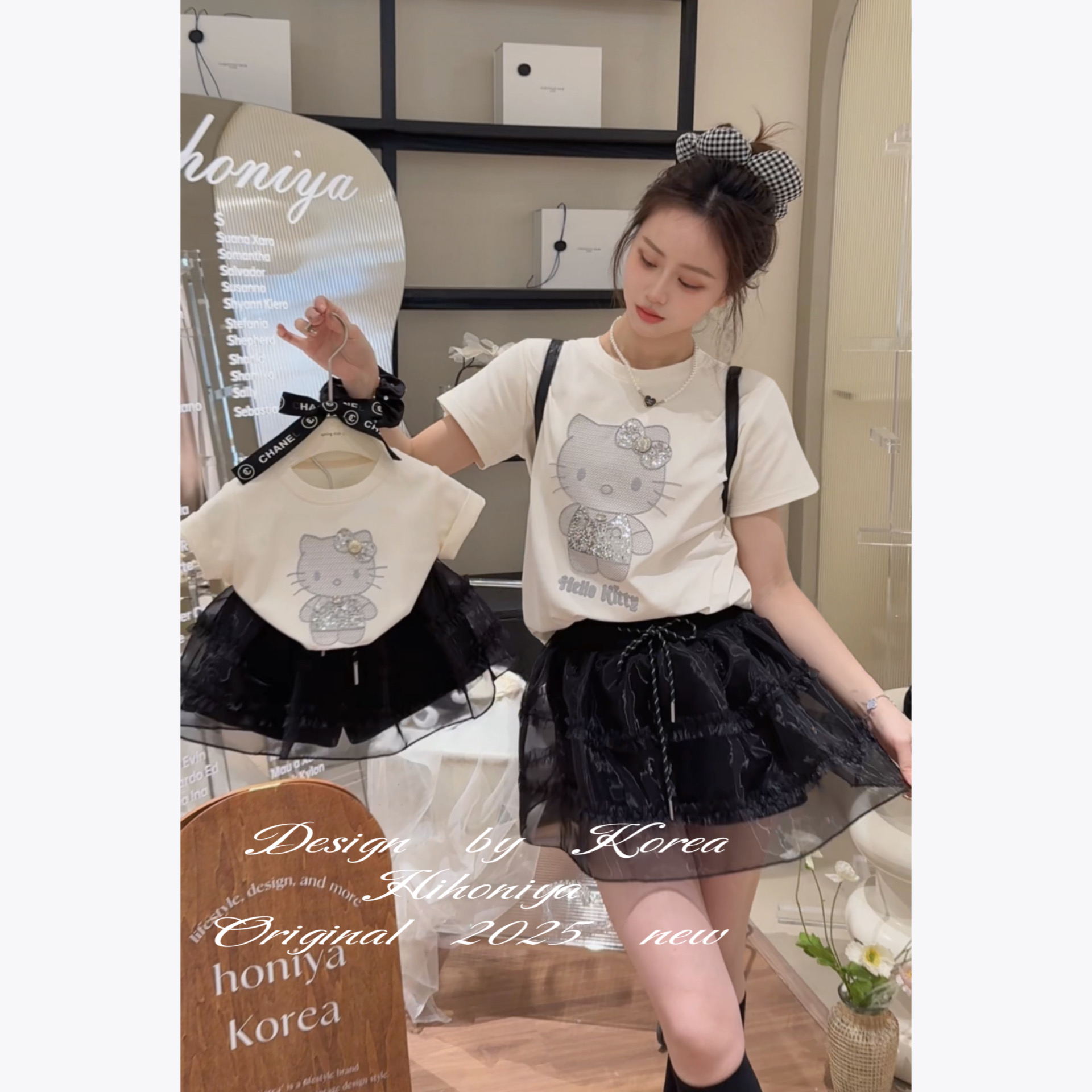 Spring韩国童装2025年夏季新款亲子亮片可爱Kitty短袖女童圆领T恤