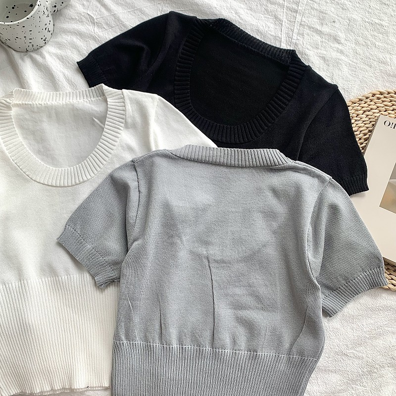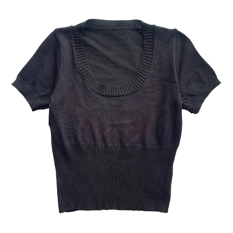 漏锁骨针织法式灰色短袖T恤U领