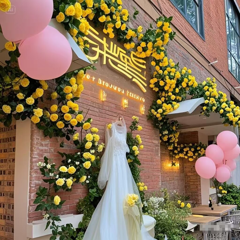 网红黄玫瑰花墙仿真花藤餐