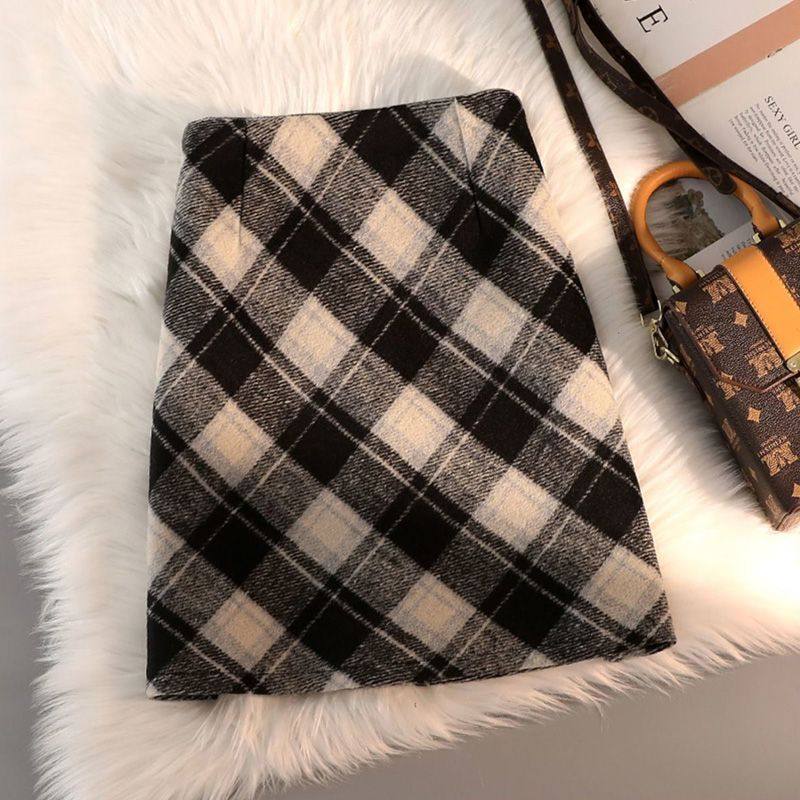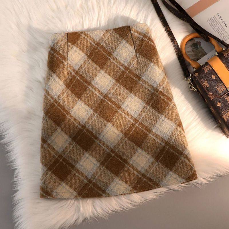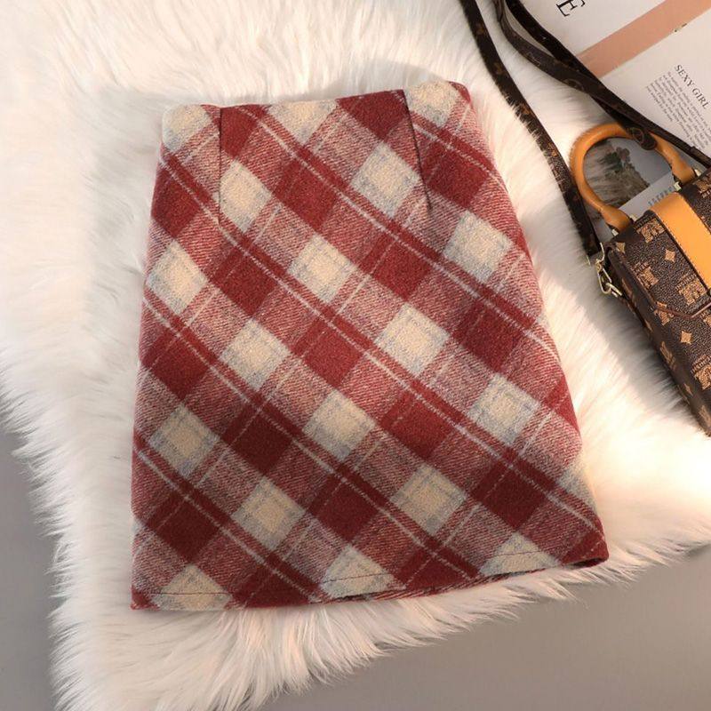 复古安可拉红格子毛呢半身裙女秋冬新款高腰包臀短裙呢子A字裙子