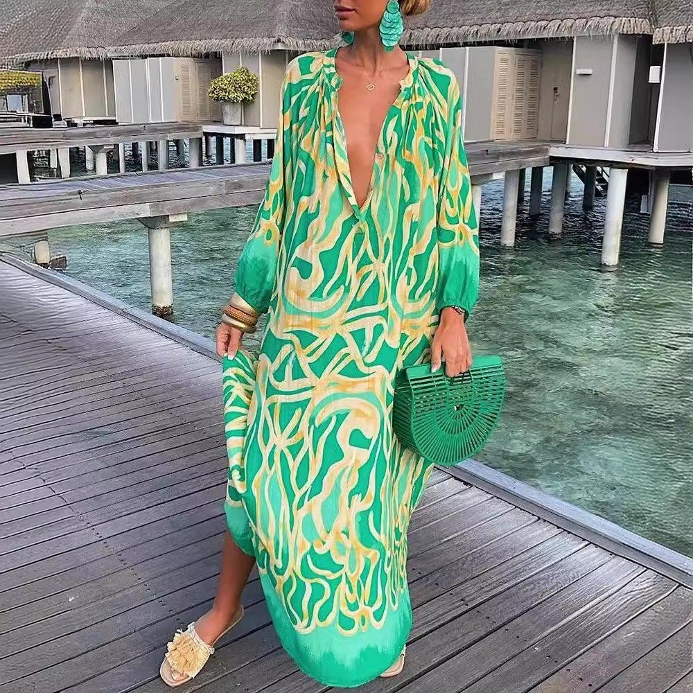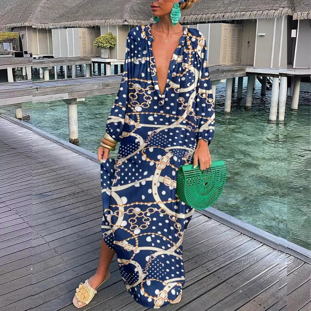 Women's dress欧美度假沙滩连衣裙波西米亚大码长袖宽松衬衫长裙