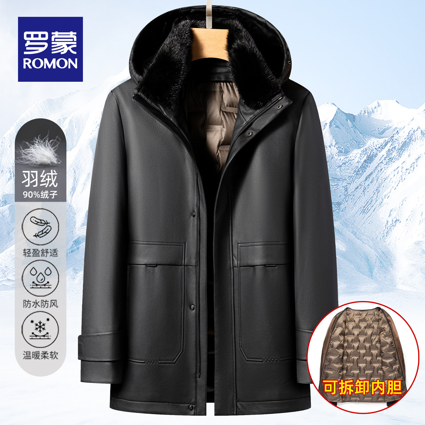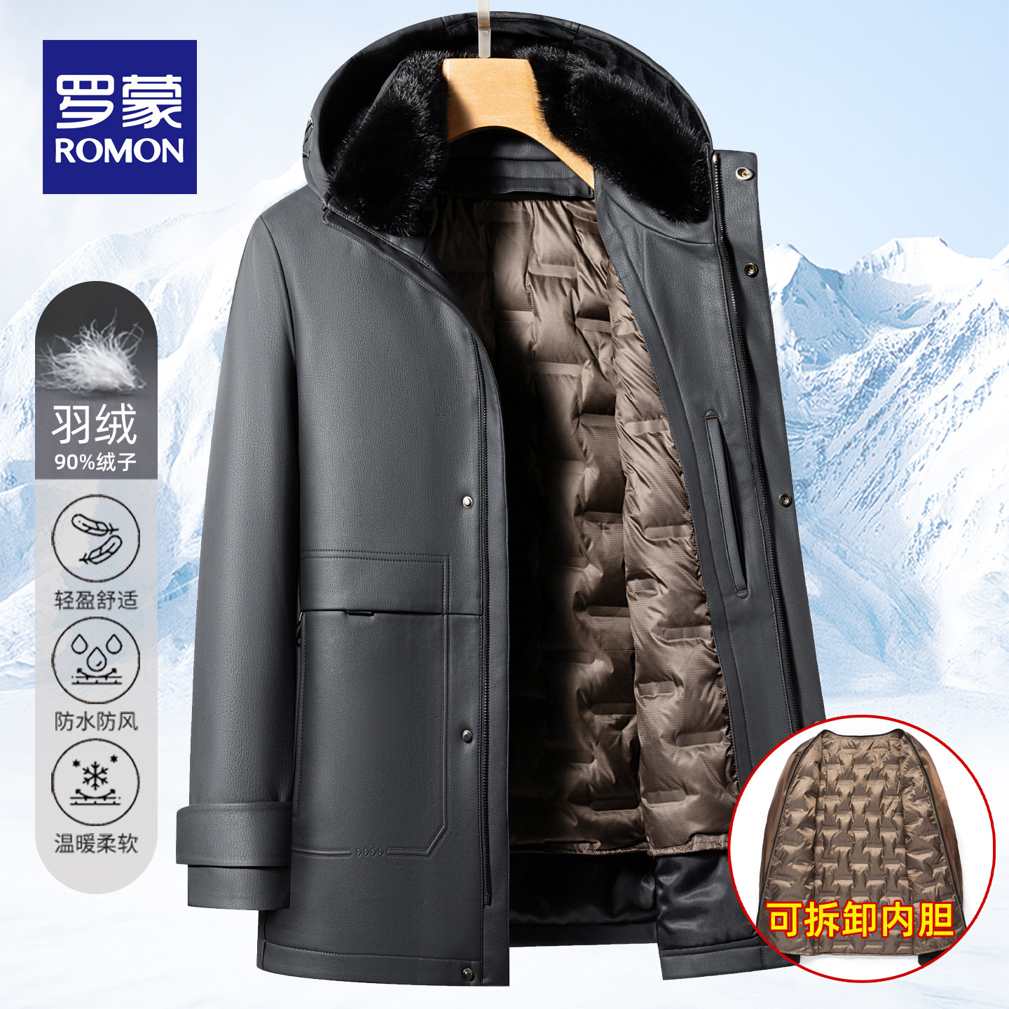 罗蒙连帽90%绒子可拆内胆羽绒服