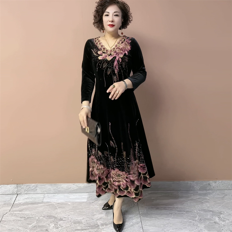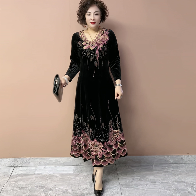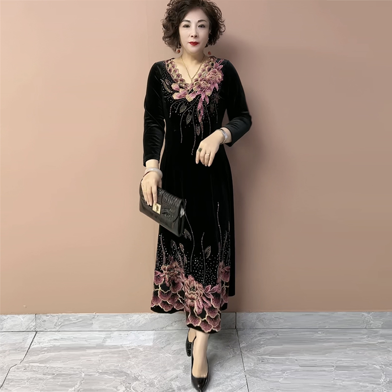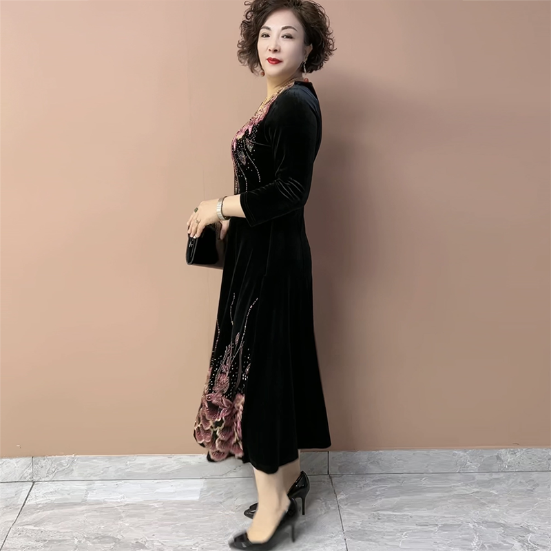 阔太太高档时尚气质减龄中年妈妈大码弹力刺绣丝绒旗袍长款连衣裙