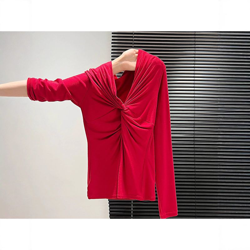 白色v领长袖t恤女秋季百搭设计感扭修身显瘦结打底衫女外穿上衣潮